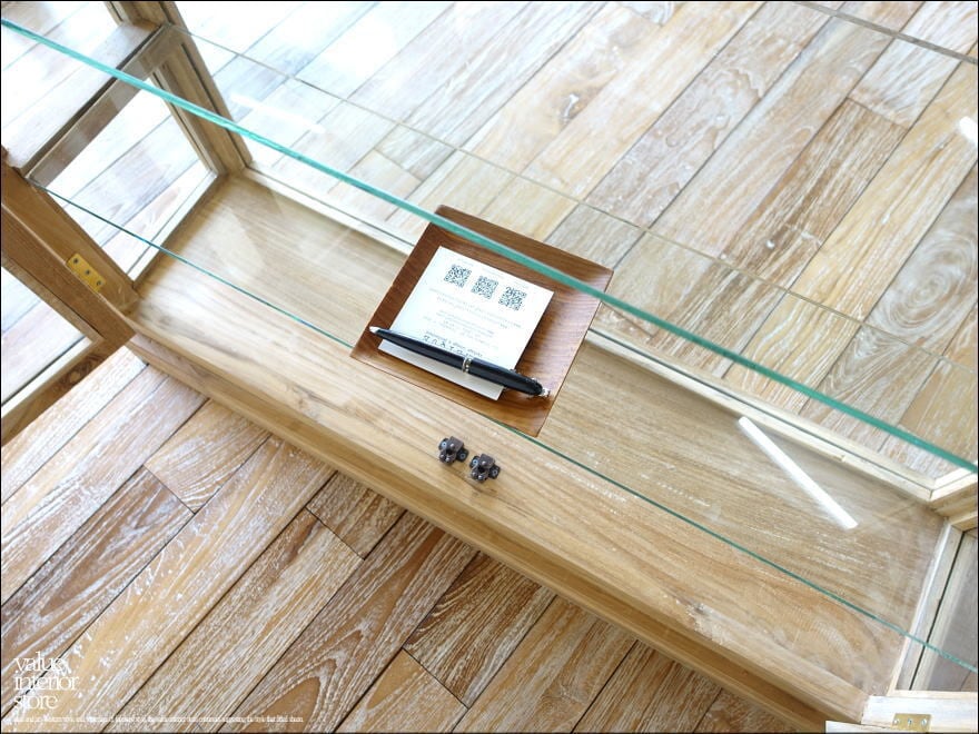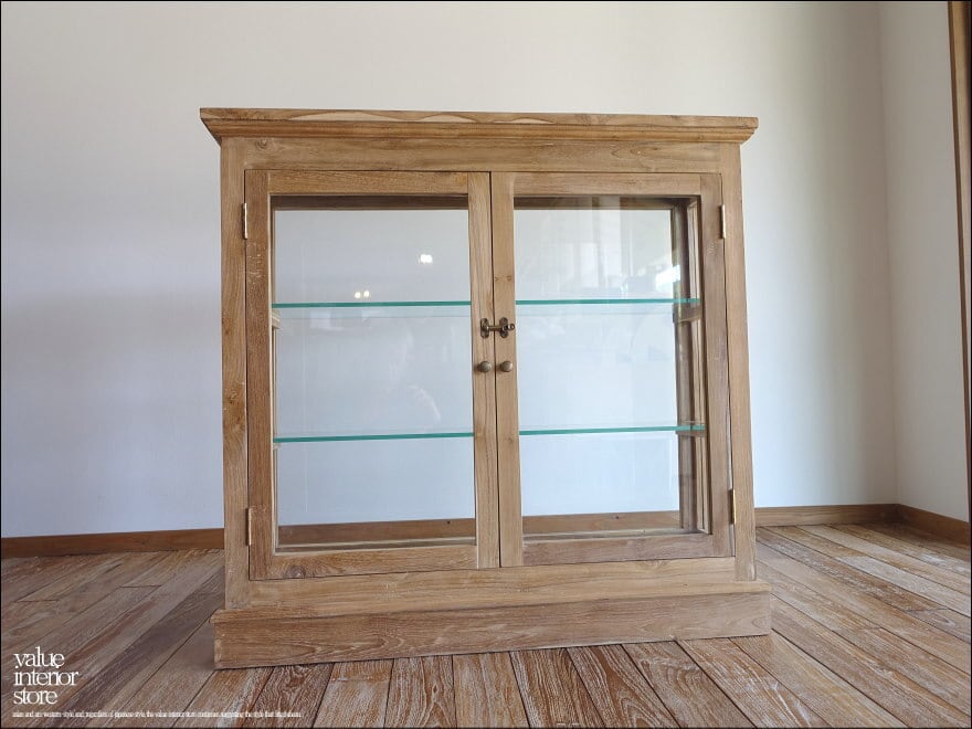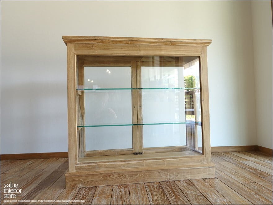 ナチュラルなチーク無垢材の素材感に溢れるガラスショーケース”Vitri/N” 天板を含めて五面ガラスでどの角度からも中に光を取り入れやすく、飾っていただくものを引き立たせてくれます。お店のショーケースとしてもぜひお使いください。表面は無塗装(発送前に薄くオイルを伸ばします)ですので、変わり行く色の変化(いわゆるチークカラーへの変化)をお楽しみいただけます。1点1点手作りで、無垢材の素朴な質感を十分に感じさせてくれます。