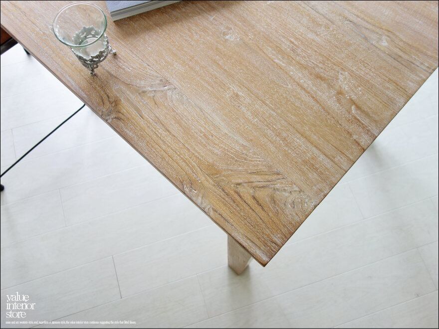 良質の部分だけを材料取りしていますので、樹皮に近い”しらた”と呼ばれる部分は見受けられません。天板を支える幕板もしっかりと厚みがあり重厚感があります。シンプルなデザインで仕上げることで、粋な雰囲気に仕上がりました。チークの張と硬い特徴を引き出す角型の脚がとても上品で、チークの良さを存分に楽しんでいただける、とてもステキなダイニングテーブル。こんなテーブルで毎日食事ができたらペースダウンできステキでしょうね。ショップやカフェのテーブルとしてもおすすめです。