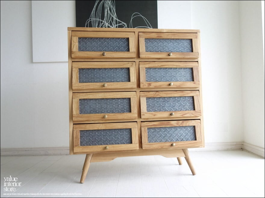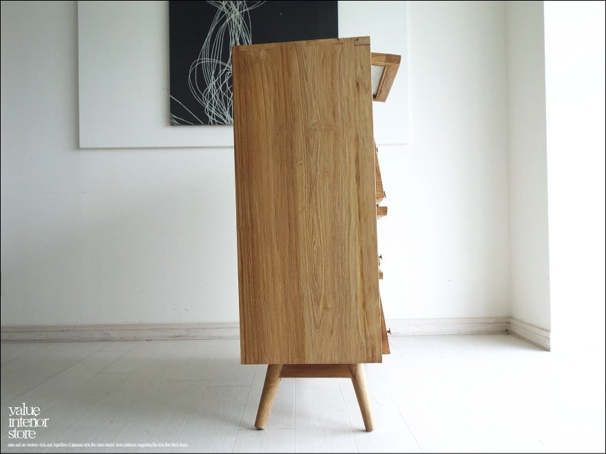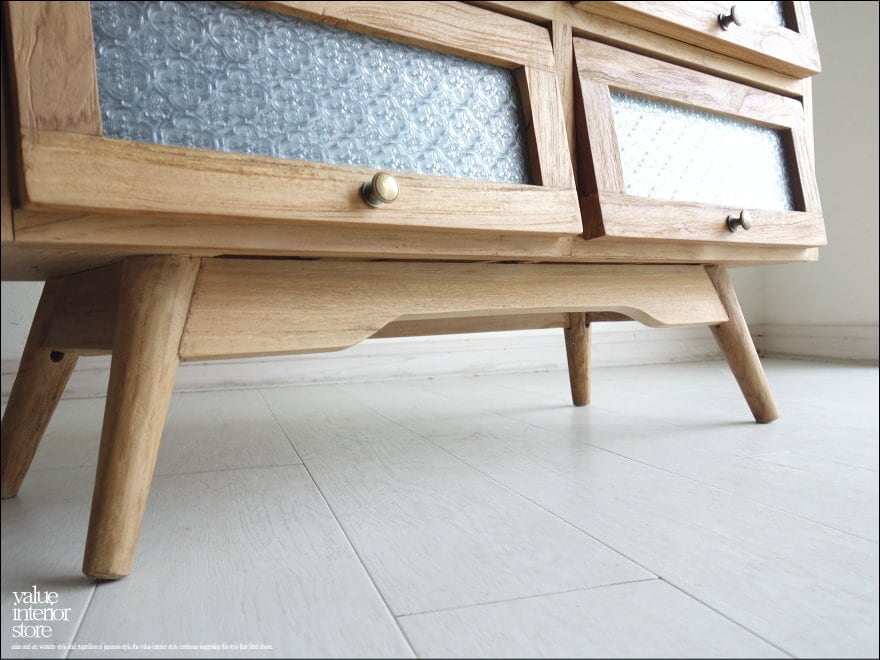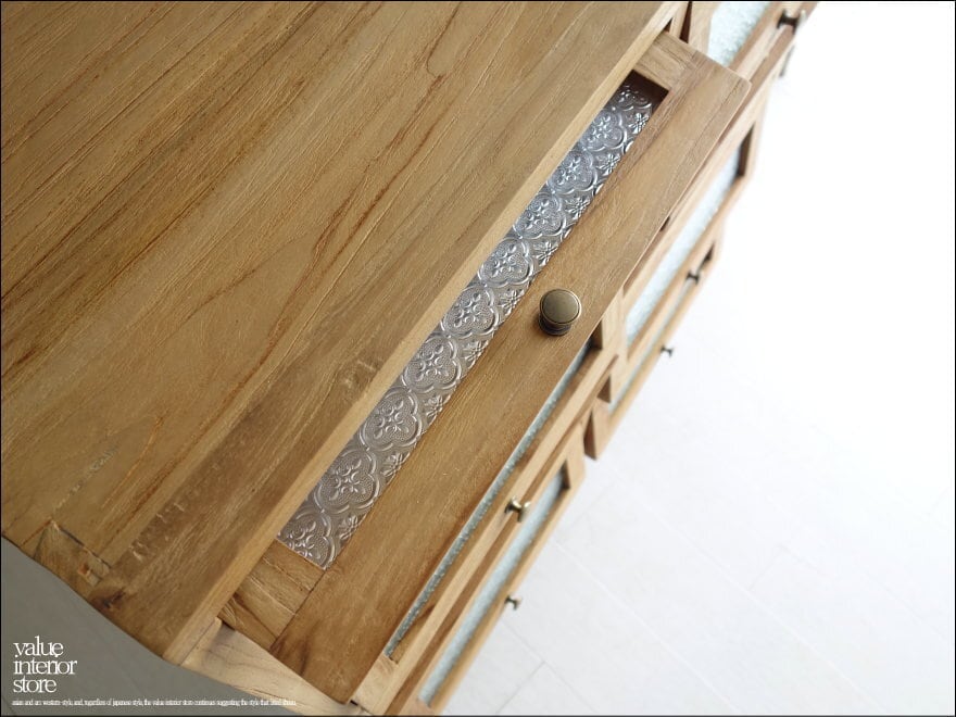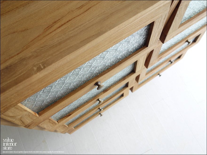 ガラス扉は引き上げるようにして開きます。ツマミは真鍮製。引き上げた扉はそのまま奥へ押し込み収納できるのでオープンの状態にも出来ます。スマートな印象ながら、ワイヤーブラシで仕上げることで、チークの持つ硬く美しい木目の特徴を引き出しています。表面もワックスフィニッシュのみですので、変わり行く色の変化(いわゆるチークカラーへの変化)をお楽しみいただけます。1点1点手作りで、無垢材の質の良さを十分に感じさせてくれます。お気に入りスペースでお使い下さい。飾りガラスの扉なので中身が見えないので気にせず収納できるのも嬉しいですね。