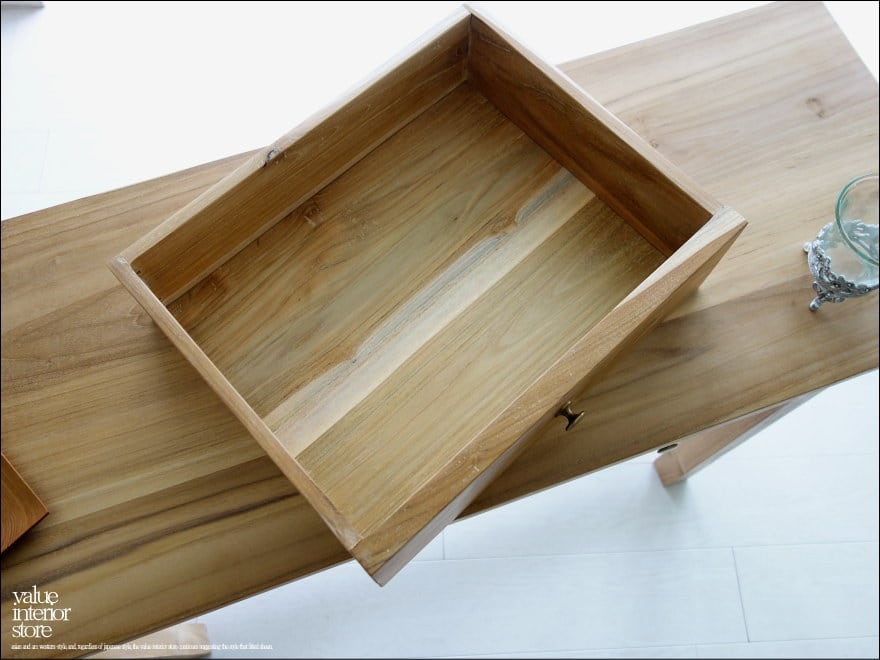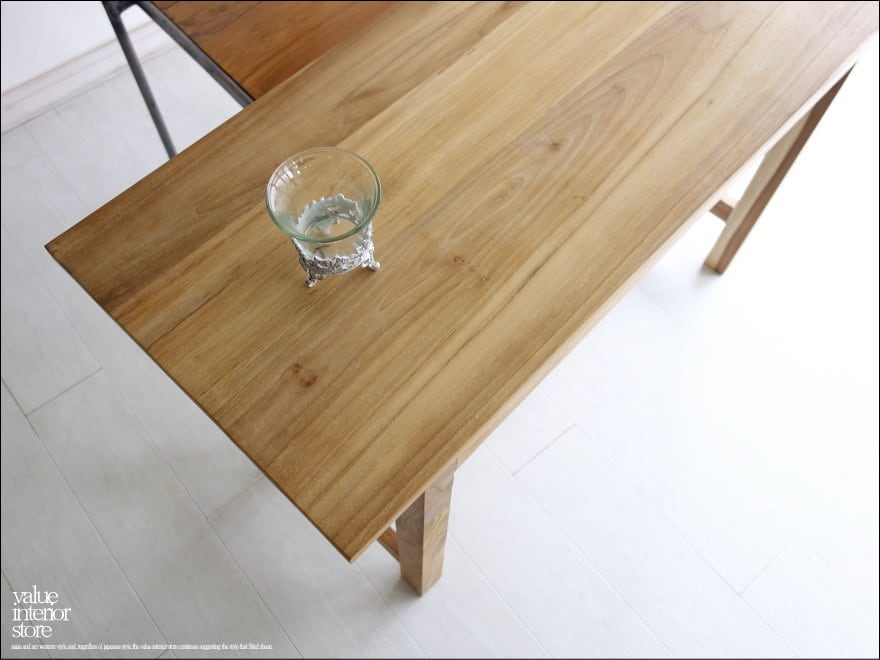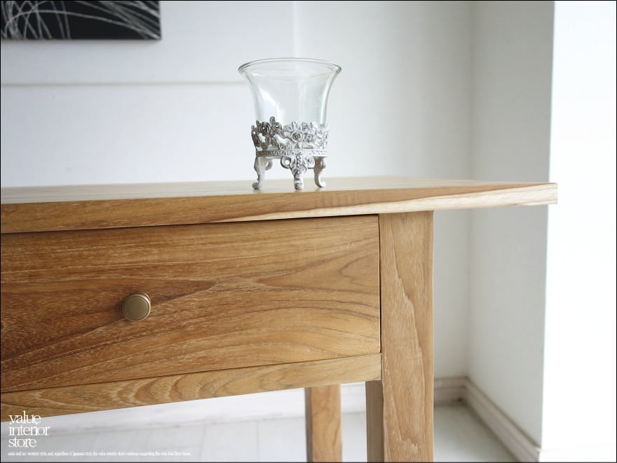 ナチュラルなチーク材の質感が魅力の総無垢材のデスクです。表面はアンフィニッシングですが、発送前に薄くミネラルオイルを塗布してお送りいたします。ナチュラルですので、良質の油分を豊富に含むチーク材は、少しづつ所謂チーク色に変化していくところも、こちらの製品の特徴で、楽しみなところです。