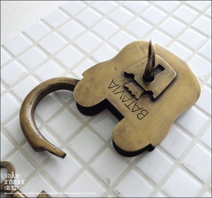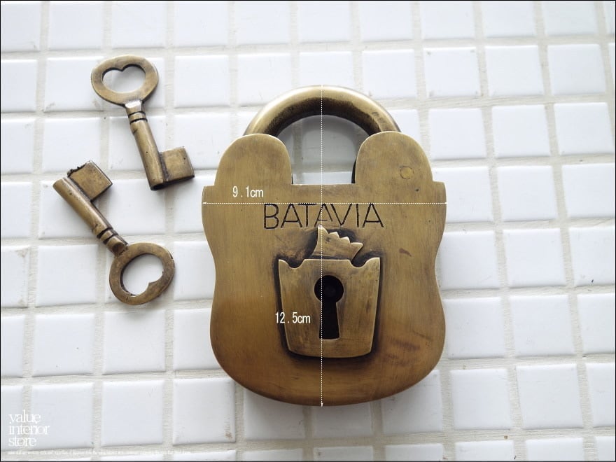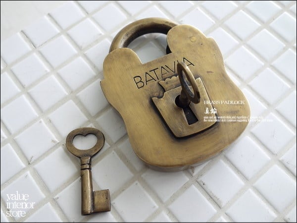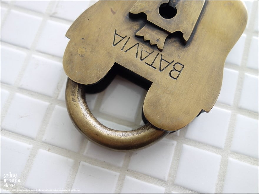真鍮南京錠BATAVIA ブラスロック 鍵 錠前 カギ 大型 真鍮金物 エスニック 手作り インドネシア製 レトロ調 幅9cm × 長さ12.5cm(約)