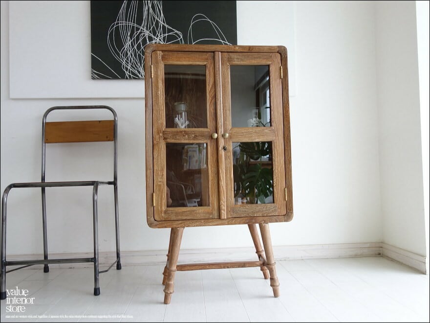 オールドチーク総無垢 キャビネットN 食器棚 ショーケース 飾り棚 陳列ケース 陳列棚 古材 レトロ ガラスケース 店舗什器 「 送料無料 」