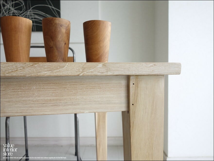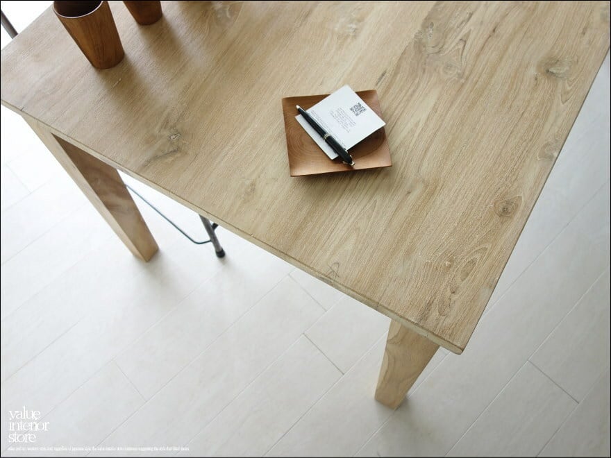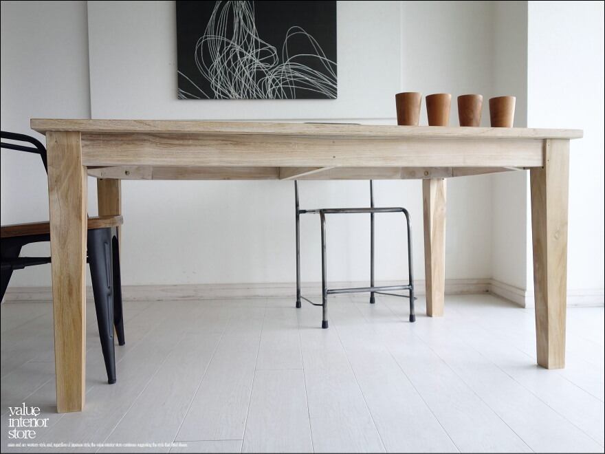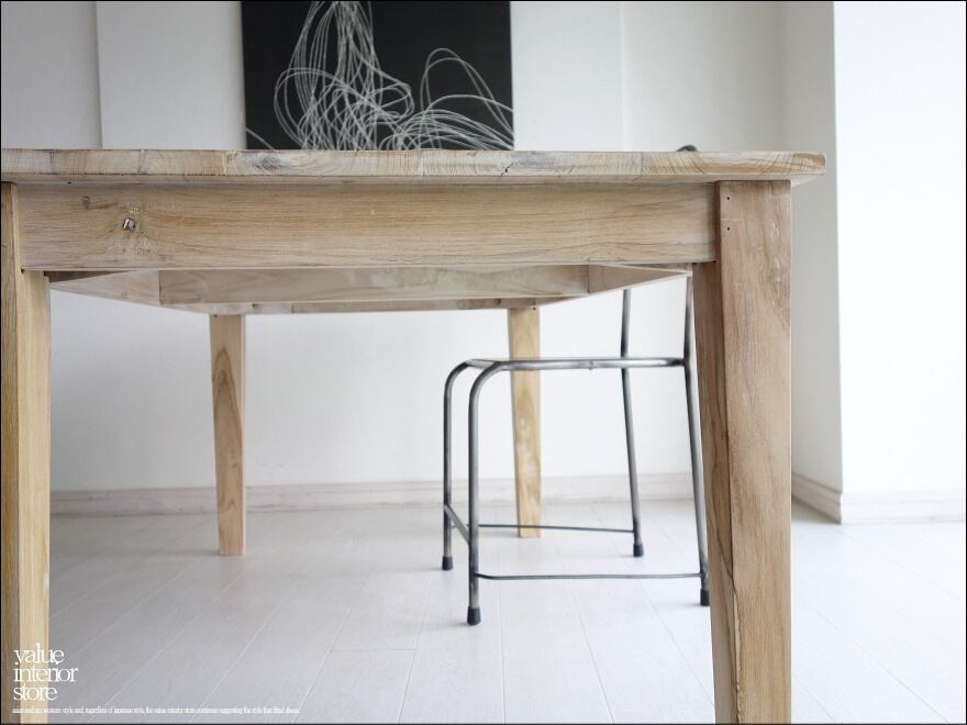 天板を支える幕板もしっかりと厚みがあり重厚感があります。シンプルなデザインで仕上げることで、粋な雰囲気に仕上がりました。チークの張と硬い特徴を引き出す角型の脚がとても上品で、チークの良さを存分に楽しんでいただける、とてもステキなダイニングテーブル。こんなテーブルで毎日食事ができたらペースダウンできステキでしょうね。ショップやカフェのテーブルとしてもおすすめです。