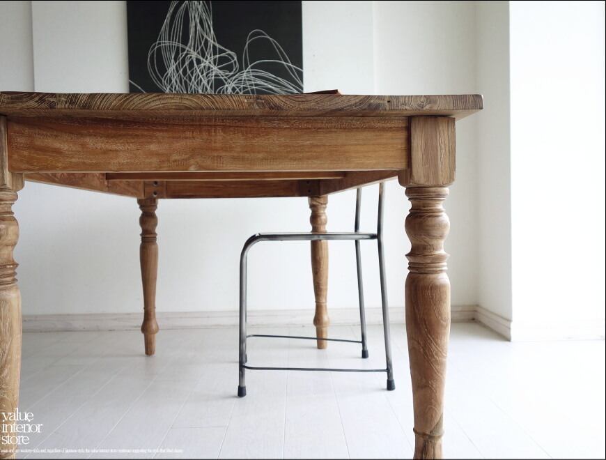 天板を支えるフレーム部分にもしっかりと厚みがあり重厚感があります。ナチュラルカラーながらスマートなデザインで仕上げることで、落ち着いた大人の雰囲気に仕上がりました。チークの渋く硬い特徴を引き出す角型の天板を柔らかな丸脚が支えていて、そのバランスがとても上品です。シンプルなデザインで、チークの良さを存分に楽しんでいただける、とてもステキなダイニングテーブル。こんなテーブルで毎日食事ができたらペースダウンできステキでしょうね。ショップやカフェのテーブルとしてもおすすめです。