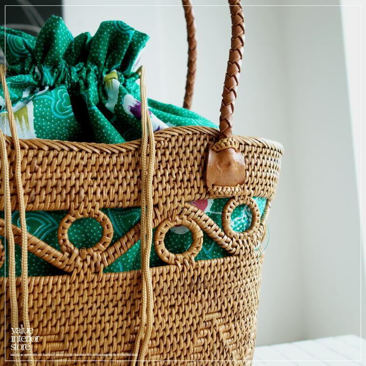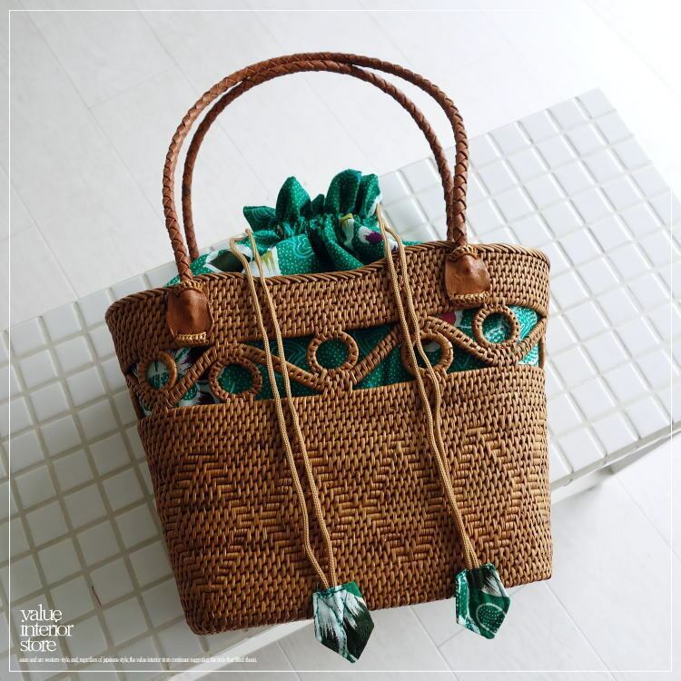 かごバッグ アタバッグKE10 手編みバッグ 浴衣や夏着物に似合います 巾着バッグ ハンドバッグ イカット 生地 和装 手づくり 天然素材