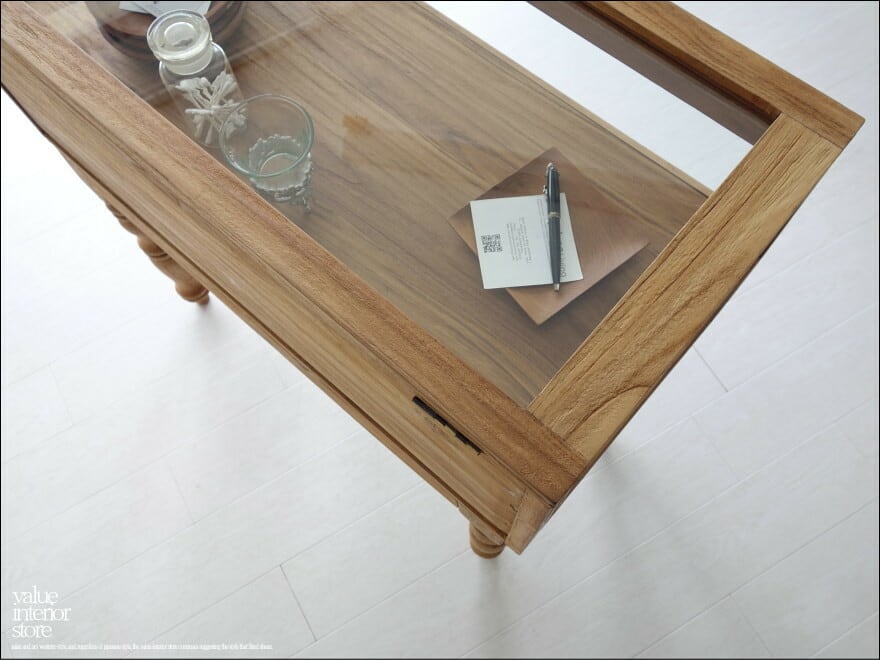 チークの上品な風合いとガラスのクリアな組み合わせが絶妙です。通常よりも荒く深めにワイヤーブラシで表面を削るラスティック仕上げにより、チークの持つ硬く力強い素材感を引き出しています。