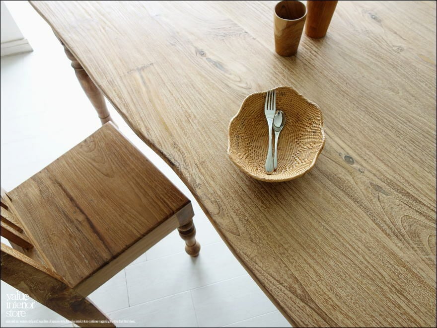 一目見ただけで木目の味わい深さを感じられるオールドチークのダイニングテーブル。