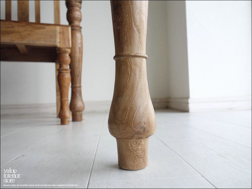 天板を支えるフレーム部分にもしっかりと厚みがあり重厚感があります。ナチュラルカラーながらスマートなデザインで仕上げることで、落ち着いた大人の雰囲気に仕上がりました。チークの渋く硬い特徴を引き出す角型の天板を柔らかな丸脚が支えていて、そのバランスがとても上品です。シンプルなデザインで、チークの良さを存分に楽しんでいただける、とてもステキなダイニングテーブル。こんなテーブルで毎日食事ができたらペースダウンできステキでしょうね。ショップやカフェのテーブルとしてもおすすめです。
