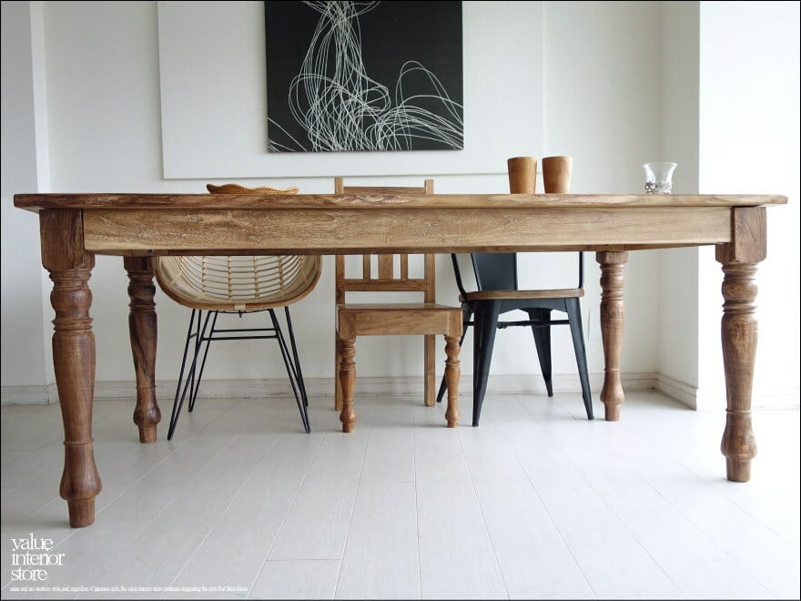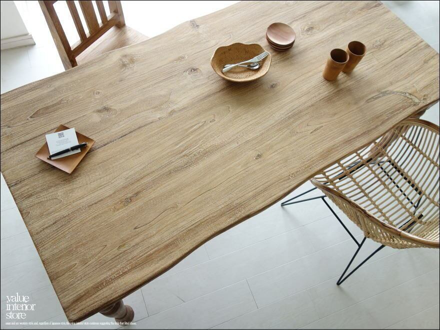 一目見ただけでフシなどの変化にとても富んだ木目の味わい深さを感じられるオールドチークのダイニングテーブル。