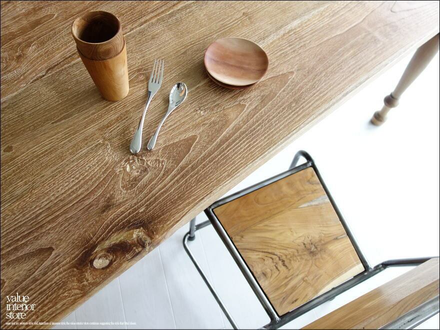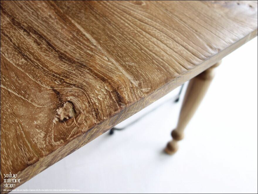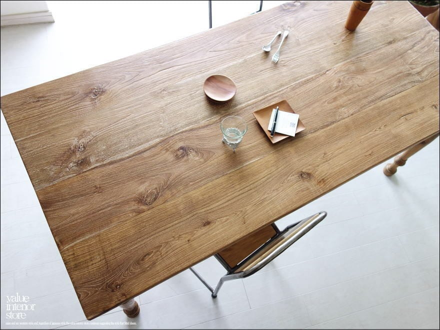 一目見ただけでフシなどの変化にとても富んだ木目の味わい深さを感じられるオールドチークのダイニングテーブル。
