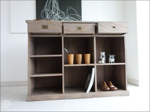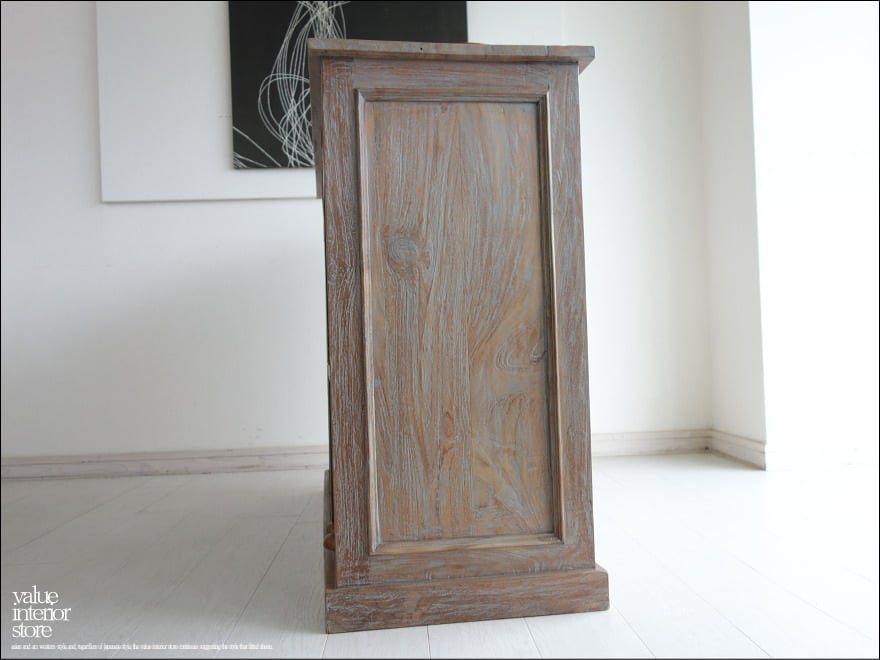 凹みなどにグレーを薄くぼかして塗布してあります。これは経年につれチーク材の油分が滲み出ることで一層渋い色合いに徐々に変化していきます。レジカウンターやバーカウンターとしてお勧めで、引出しの取っ手には大きめの無垢の真鍮ハンドルを使用しましたので引出しやすく使い勝手も良いです。アンティークの雰囲気さえ感じられるカウンターです。飲食店や美容室のレジ台にぜひどうぞ!