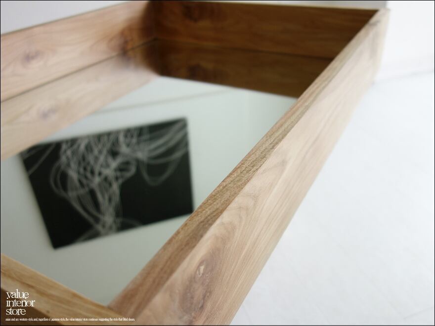 木目が美しいシンプルなデザインのチークウォールシェルフ型ミラー。