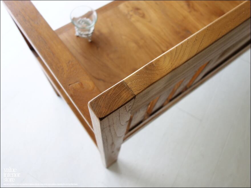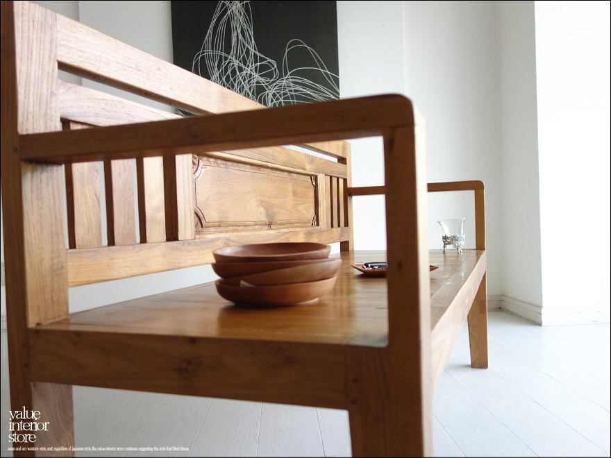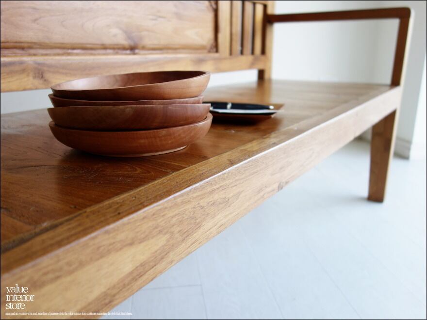 インドネシア職人にしてはかなりシンプルなデザインです。スマートな脚や、背もたれの彫り細工には昔の職人さんが丹精こめて作った印象を受けます。全体的に見られる美しい木目も特徴で、オールドチークならではの落ち着いた雰囲気に包んでくれます。カフェやショップの什器としてもお勧めです。ぜひこの機会にどうぞ。