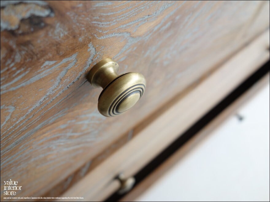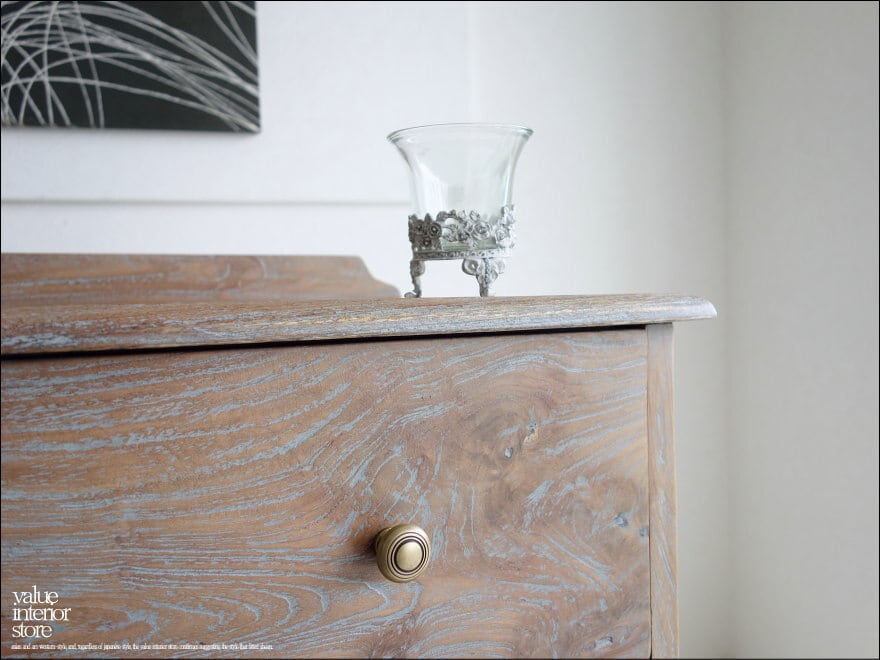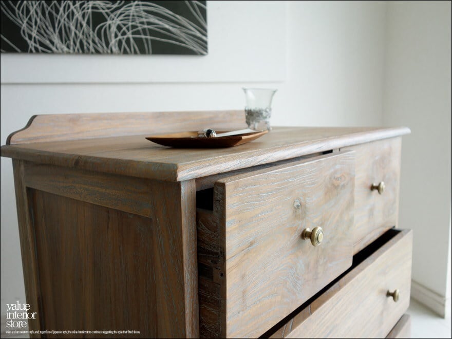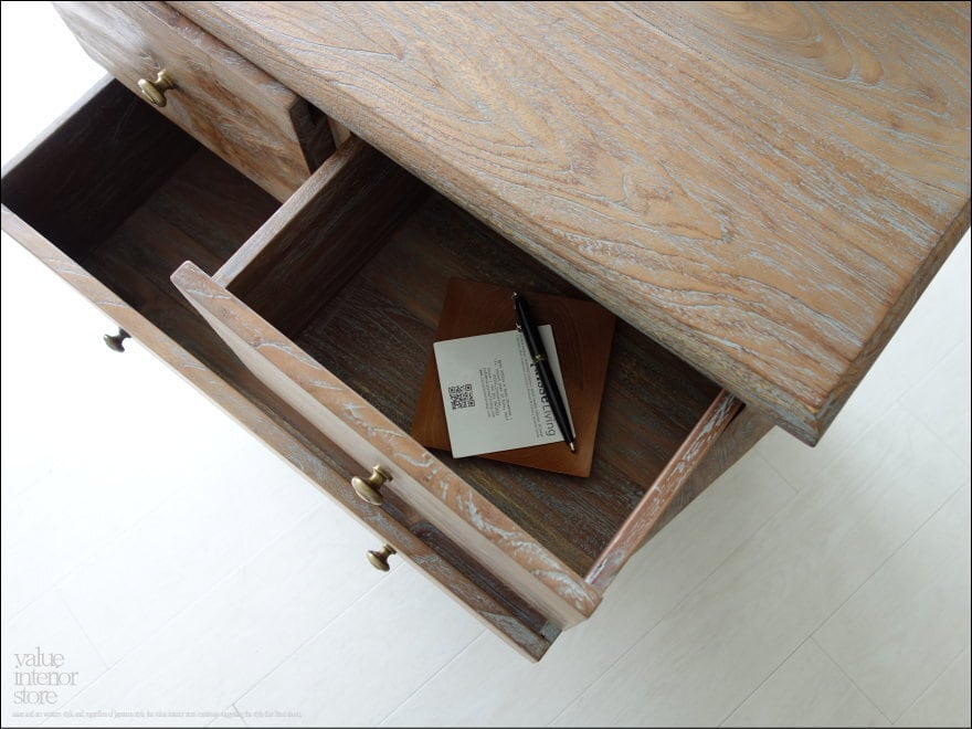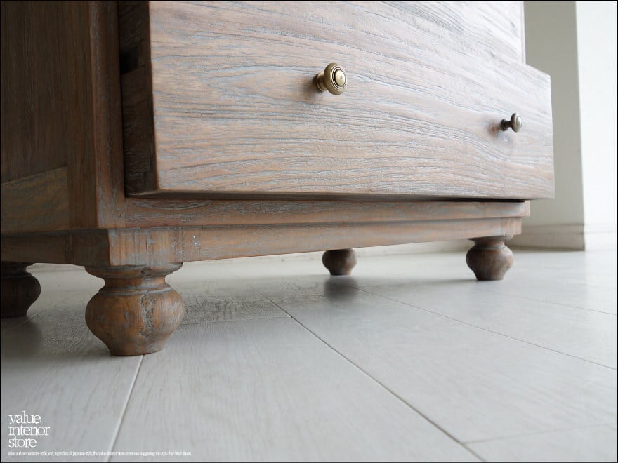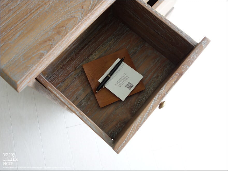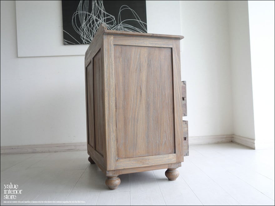 凹みなどにグレーを薄くぼかして塗布してあるエイジング仕上げで、チークの持つ張りと硬く美しい木目の特徴を引き出しています。天板部分はフラットなのでお気に入りの小物などをディスプレイしてお楽しみください。また、チークは油分を多く含みますので、お使いいただくうちにさらに色味に深みが増すところも楽しみの一つです。1点1点手作りで、無垢材の素材の良さを感じさせてくれます。