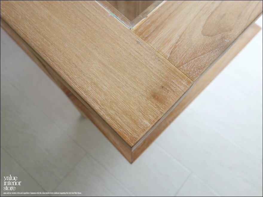 表面をワイヤーブラシで削ってからホワイトを塗布して、さらに磨き上げ、凹みに白色を僅かに残すホワイトウォッシュ仕上げ。手間のかかる表面仕上げは、とてもシャビーシックな印象に仕上がっています。硬いチーク材だからこそできる仕上げ方法です。細かな木目が美しく、独特なフォルムが印象的で目を惹くデザインです。チークの持つ渋く力強い特徴を存分に引き出しているフレームと天板のガラスとのバランスがとても良いです。お部屋のリビングなどお気に入りスペースでぜひお楽しみ下さい。