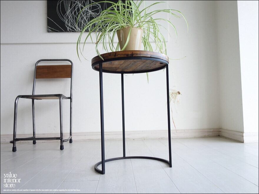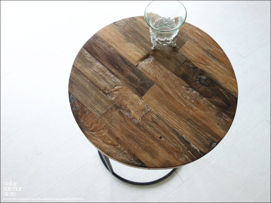 古材(オールドチーク)の変化に富んだ凹凸やフシなどのキャラクターが素敵な天板と鉄脚のサイドテーブル。