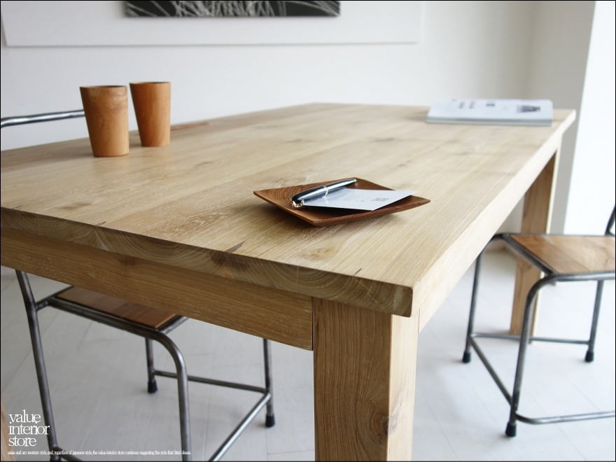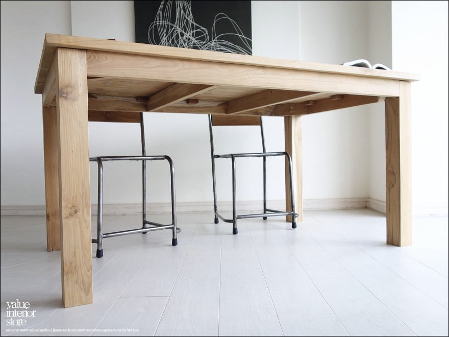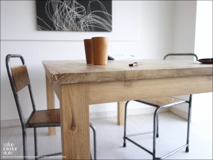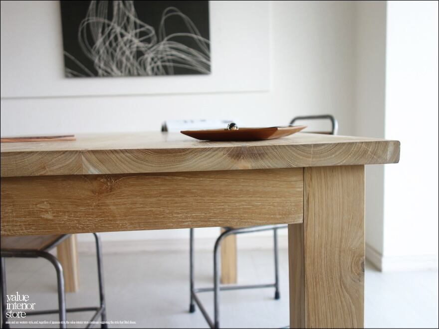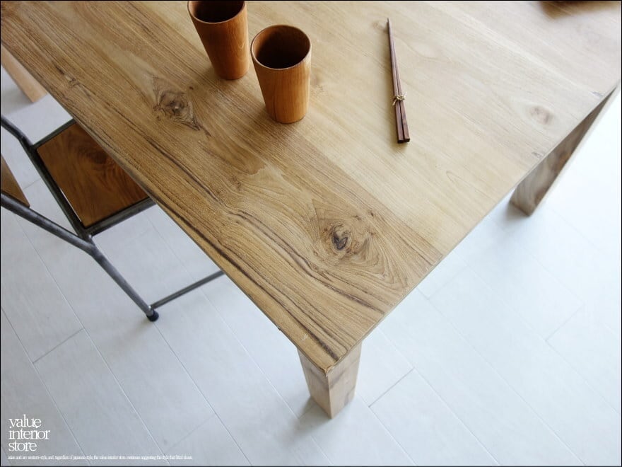 天板を支える脚は太さがあり、どっしりとしていて力強いです。チークの特徴のある木目やフシなどの個性的なキャラクターが素敵で、また、手作りでしか出せない素朴な質感が何とも言えません。良質な油分を豊富に含むチーク材ですので、徐々にチーク色に変化していくところも楽しんでいただけるダイニングテーブル。こんなテーブルで毎日食事ができたらステキでしょうね。ショップやカフェのテーブルとしてもおすすめです。