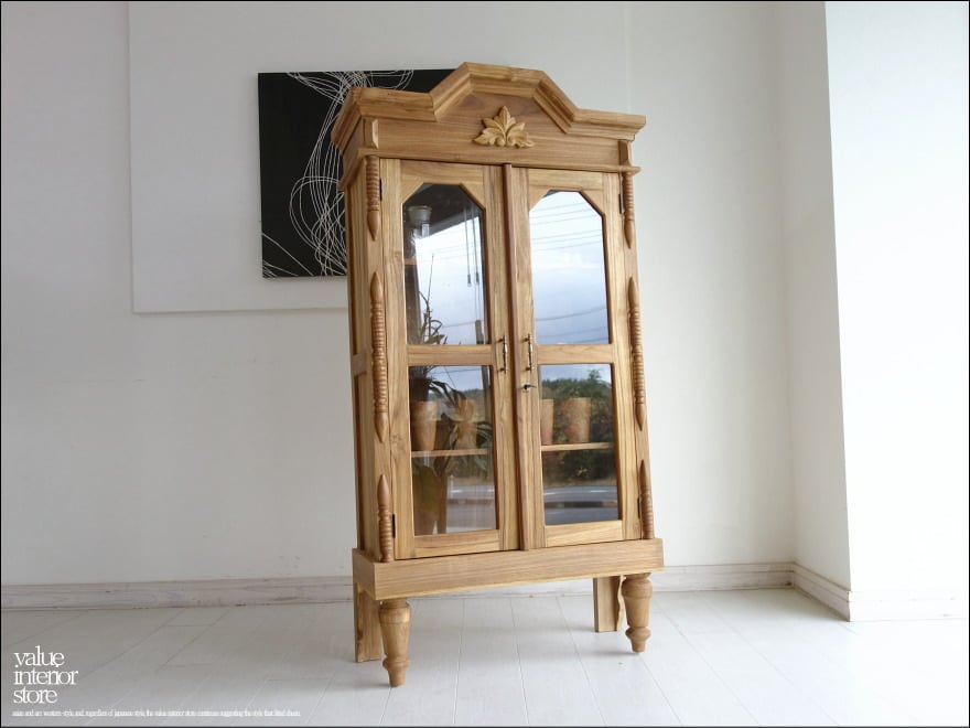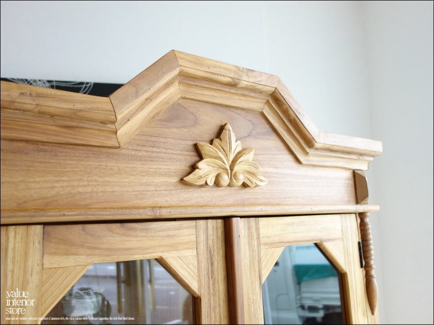 上部の彫り物が、この家具のシンボルマークとなっていて印象的です。クリアガラスで中身が見えるのでディスプレイするような感覚で中に入れるものにもこだわりたくなりますね。食器はもちろん、本棚、収納棚、カフェやショップなどの什器としてもおすすめです。
