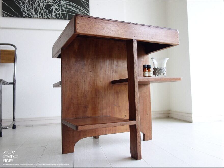 チーク総無垢材 ヴィンテージサイドテーブル R/1 シェルフ 棚 アンティークテーブル 机 什器 陳列台 表面再仕上済 三大銘木 送料無料