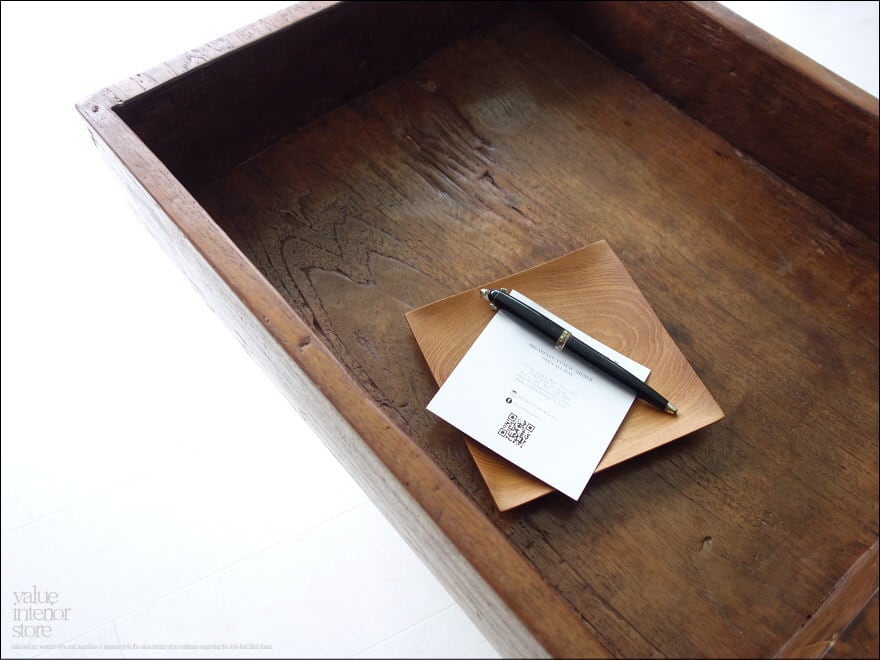 こちらは削り出して作られており、チーク独特の色合いも何とも言えず素敵です。サービングトレイとしては少し大きさがありますので、小物入れや商品のディスプレイとしてお勧めです。滅多にお目にかかれない渋いお品です。