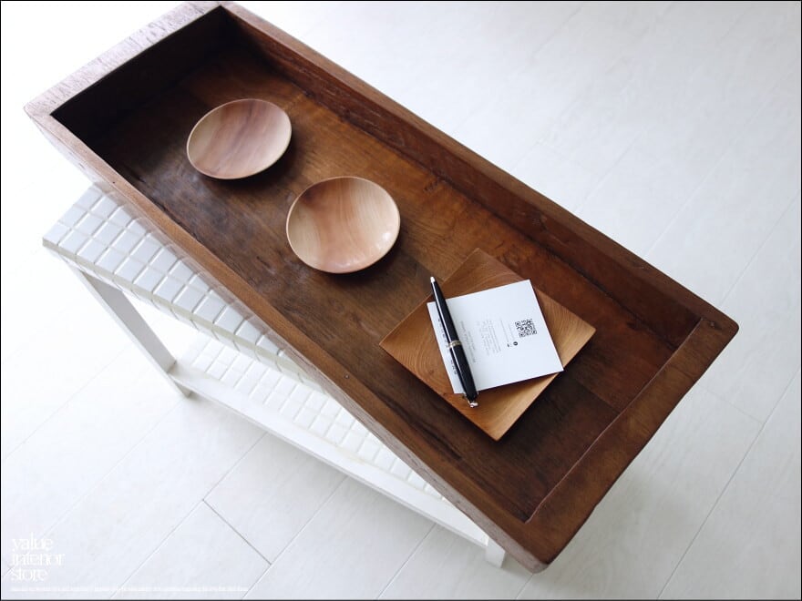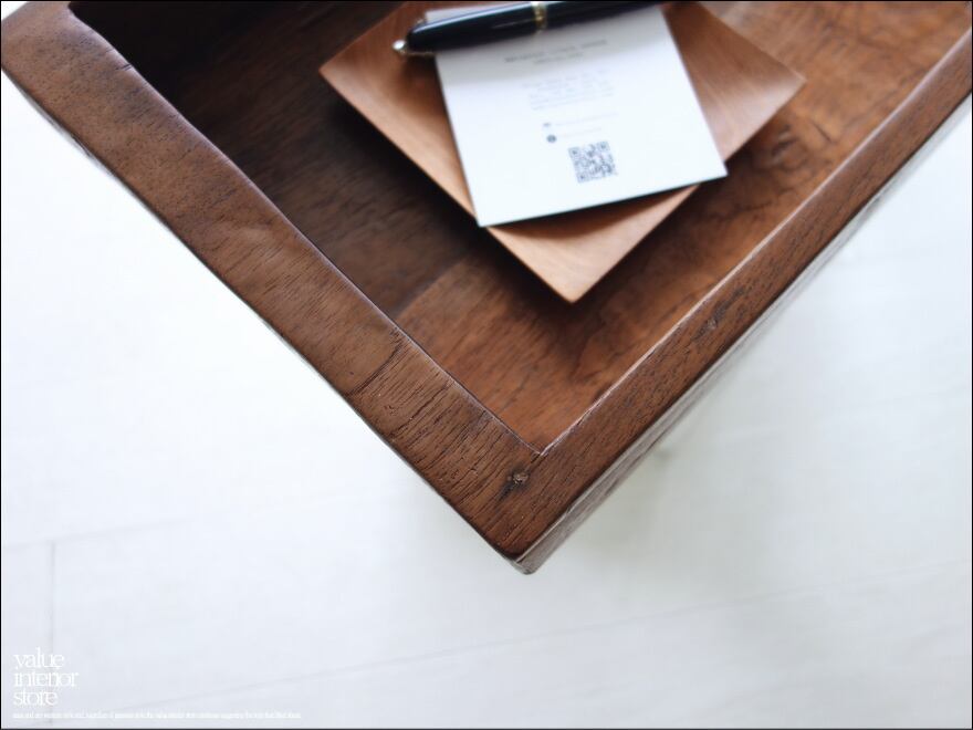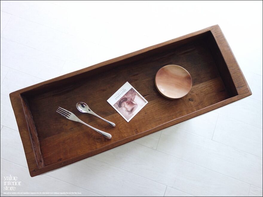 こちらは削り出して作られており、チーク独特の色合いも何とも言えず素敵です。サービングトレイとしては少し大きさがありますので、小物入れや商品のディスプレイとしてお勧めです。滅多にお目にかかれない渋いお品です。