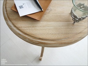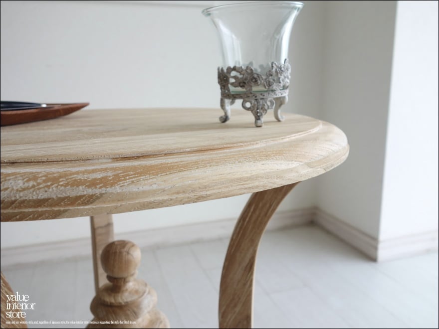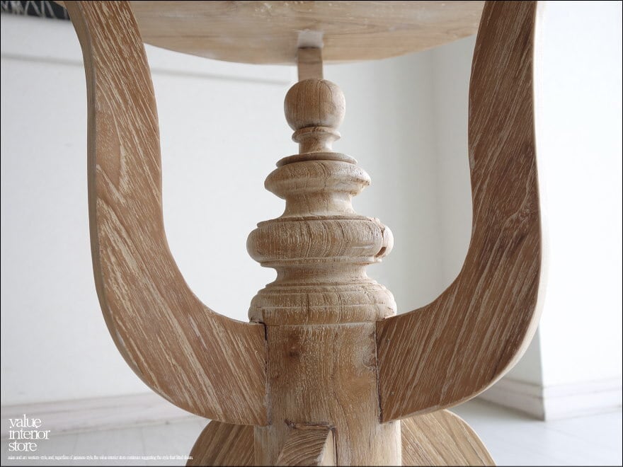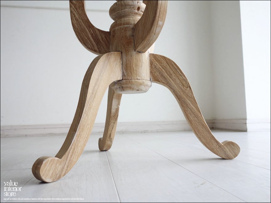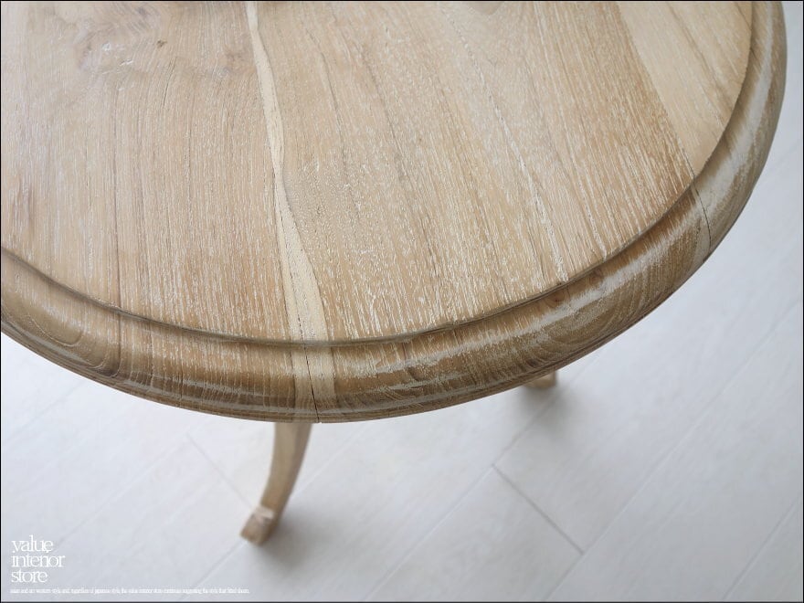 表面はワイヤーブラシで軽く削ってから白色を塗布した後に、紙やすりで再度表面を削る手法を用いていますので、シャビーな質感に仕上がっています。チークの硬く張りのある特徴を引き出す丸型の天板を美しい脚が支えていて、そのバランスがとても上品です。