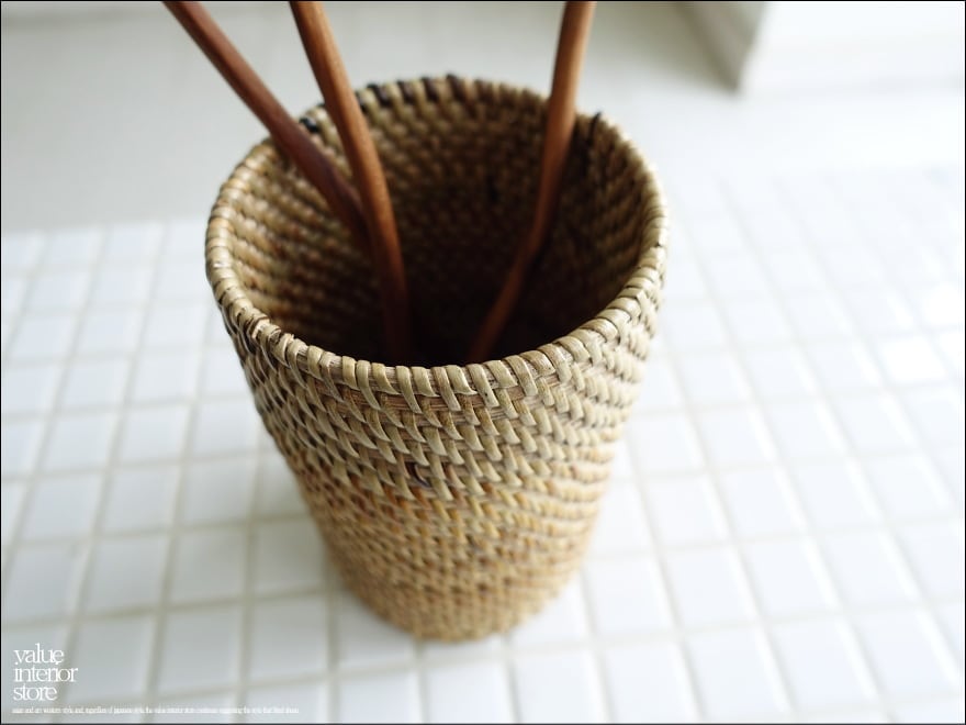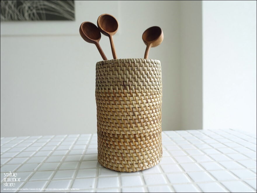 カトラリーやペンなどちょっとしたものを入れていただくラタンスタンド。 一つ一つ手編みで作られています。