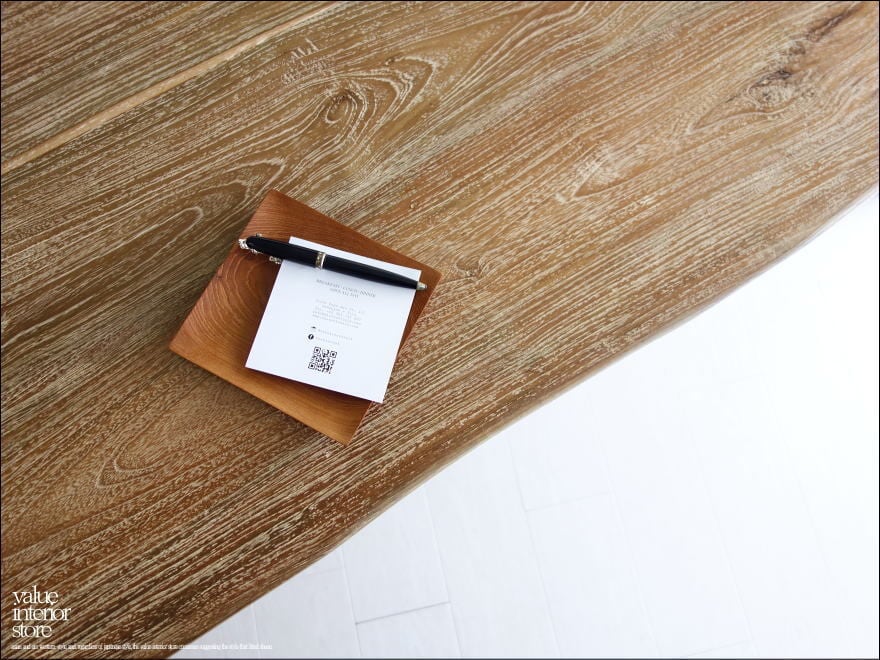 一目見ただけでフシなどの変化にとても富んだ木目の味わい深さを感じられるオールドチークのダイニングテーブル。