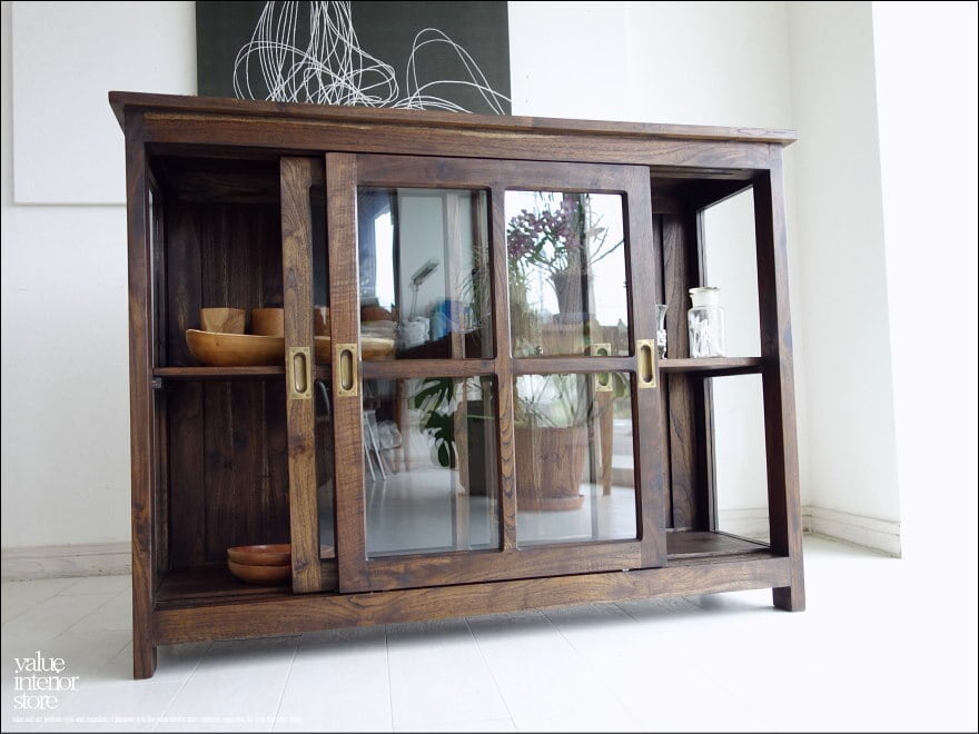 チーク総無垢で仕上げた使い勝手の良いシンプルなスライド扉ガラスキャビネット。