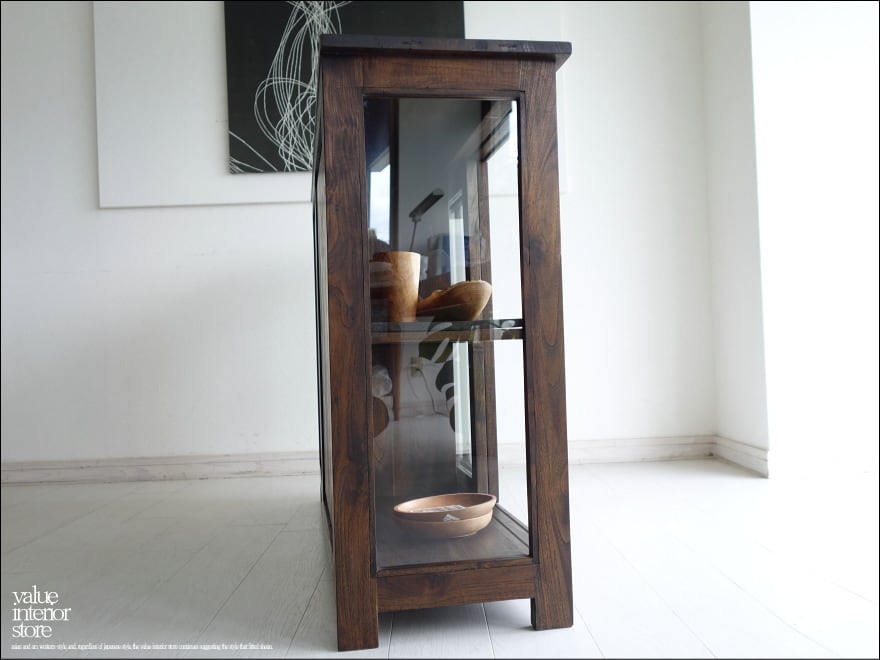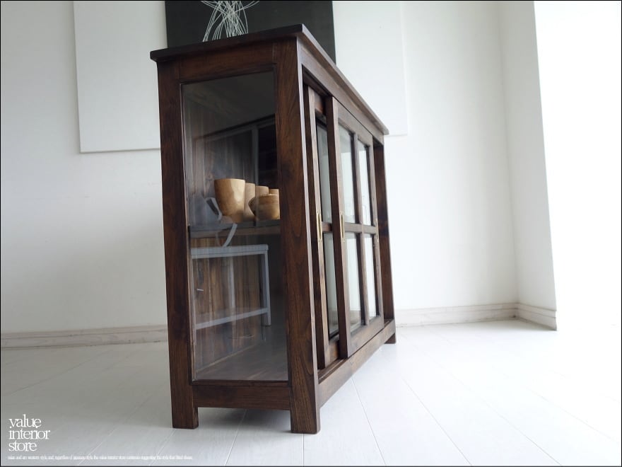 チーク材 無垢材 引戸ガラスキャビネットWM 食器棚 飾り棚 カウンター キッチン収納 ガラスケース 手作り シンプル 銘木家具 送料無料