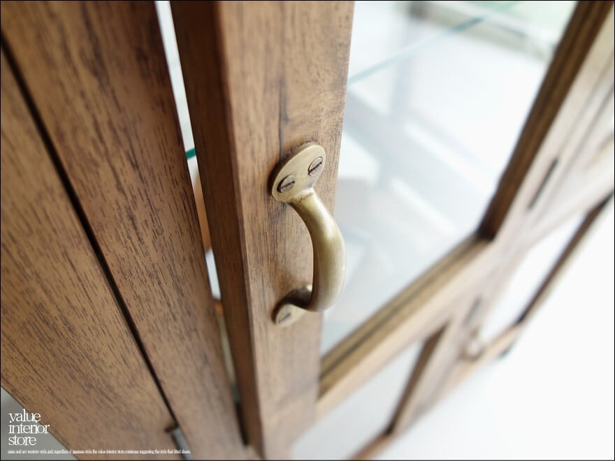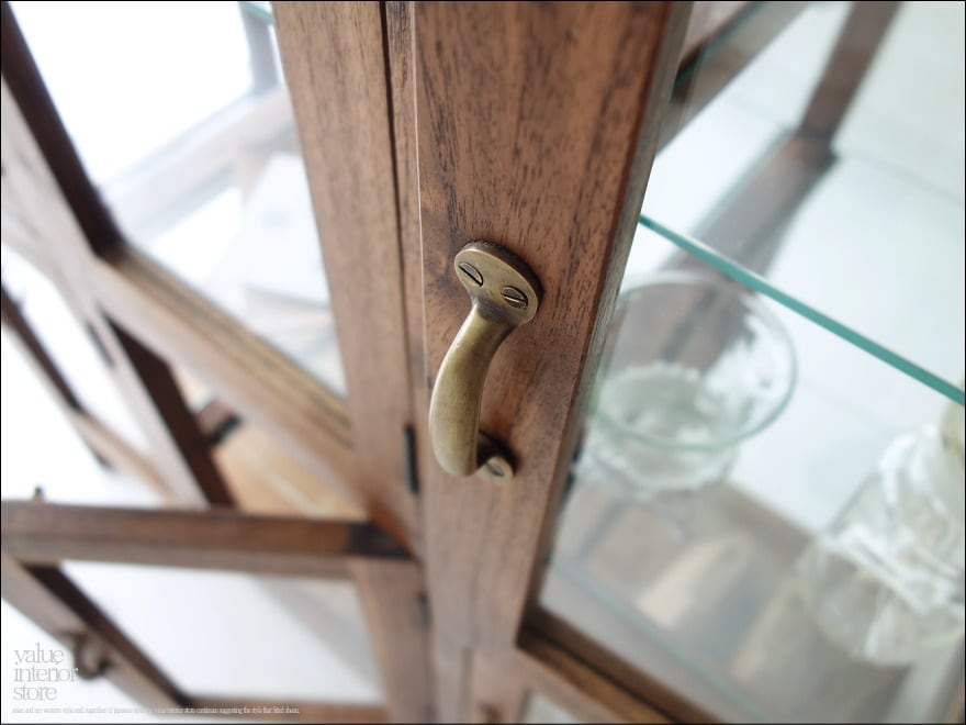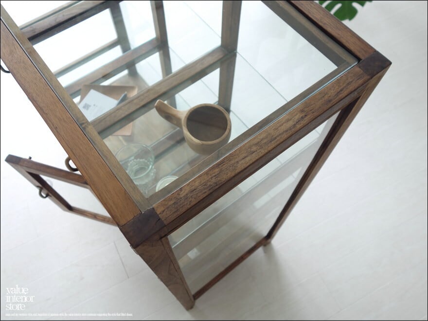 フレームはチーク総無垢材で金具は真鍮製を使用いたしました。ガラス面が多くどの角度からも中がキレイに見えますので、お店のショーケースとしてもお使いいただけます。