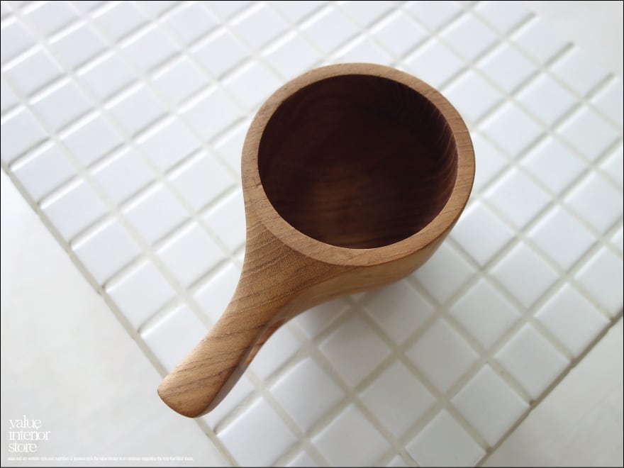 チークの独特で味のある形や木目を活かし魅力的に仕上がっています。木工旋盤とサイディング仕上げで一つ一つ手作業で製作します。表面はミネラルオイル(ライム油・大豆油・チョウジ油・ナツメグ油)仕上げ。柔らかな口当たりの良さが魅力的で、手になじみます。