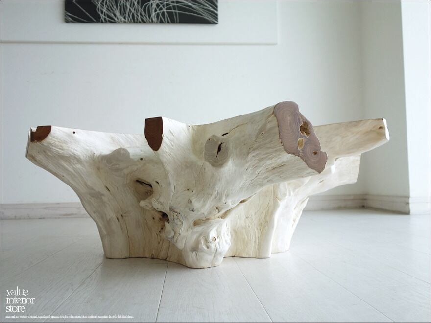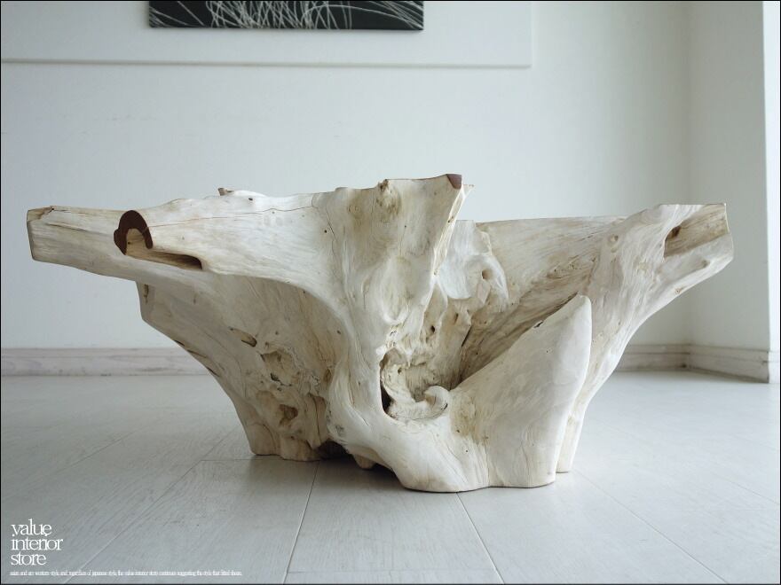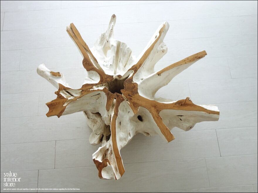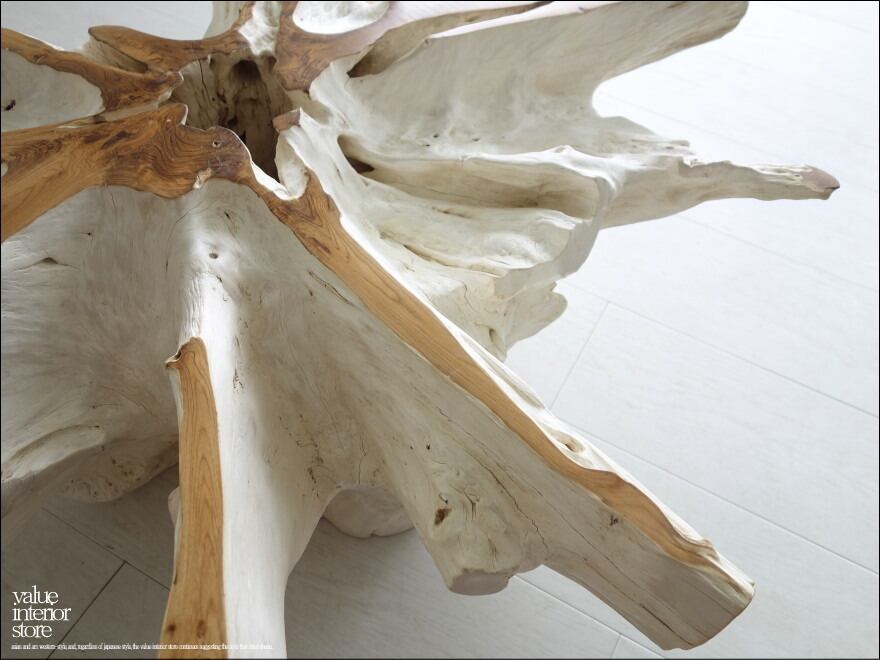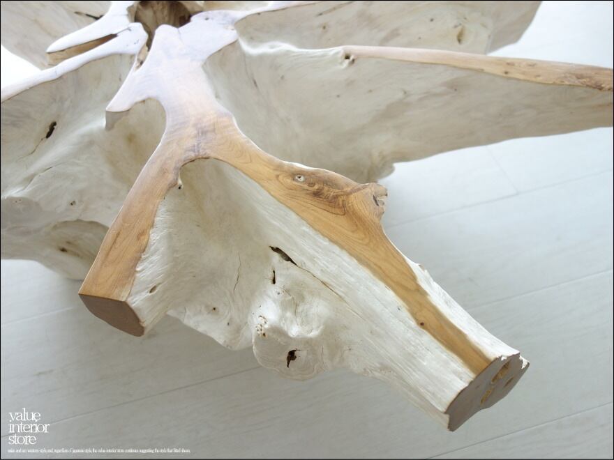チークの根本をテーブルに使った何ともプリミティブなガラステーブル。