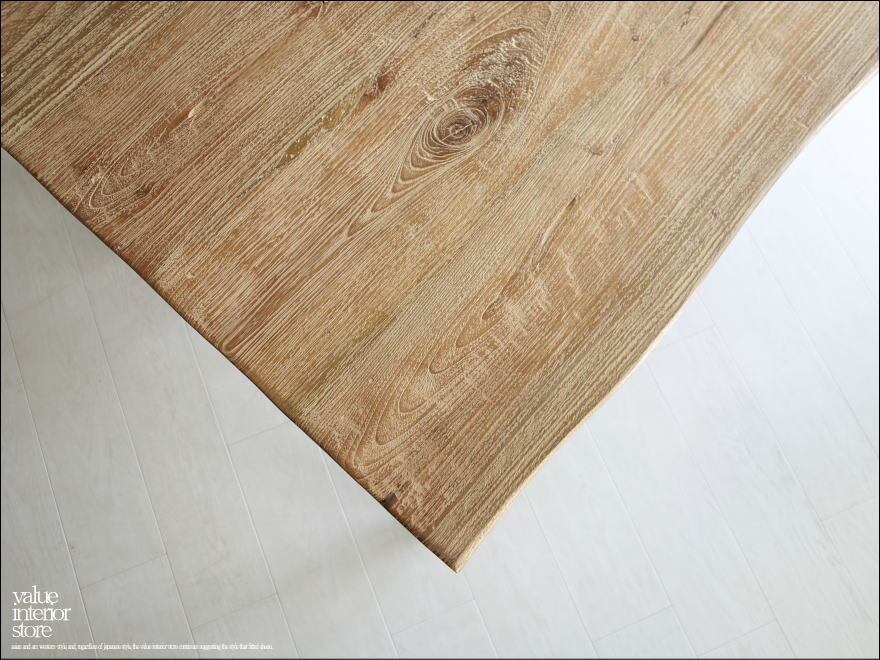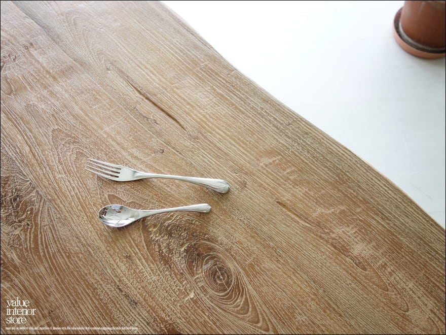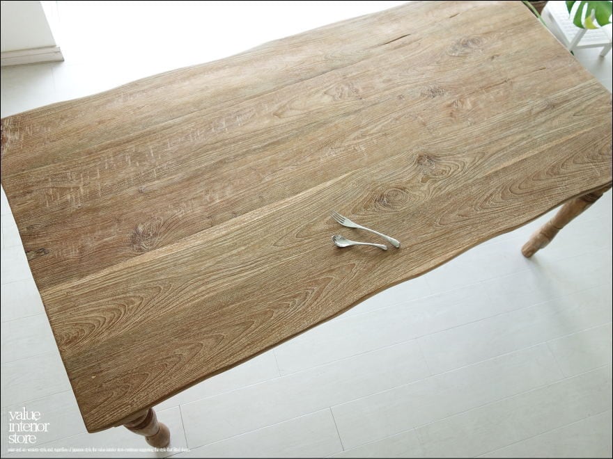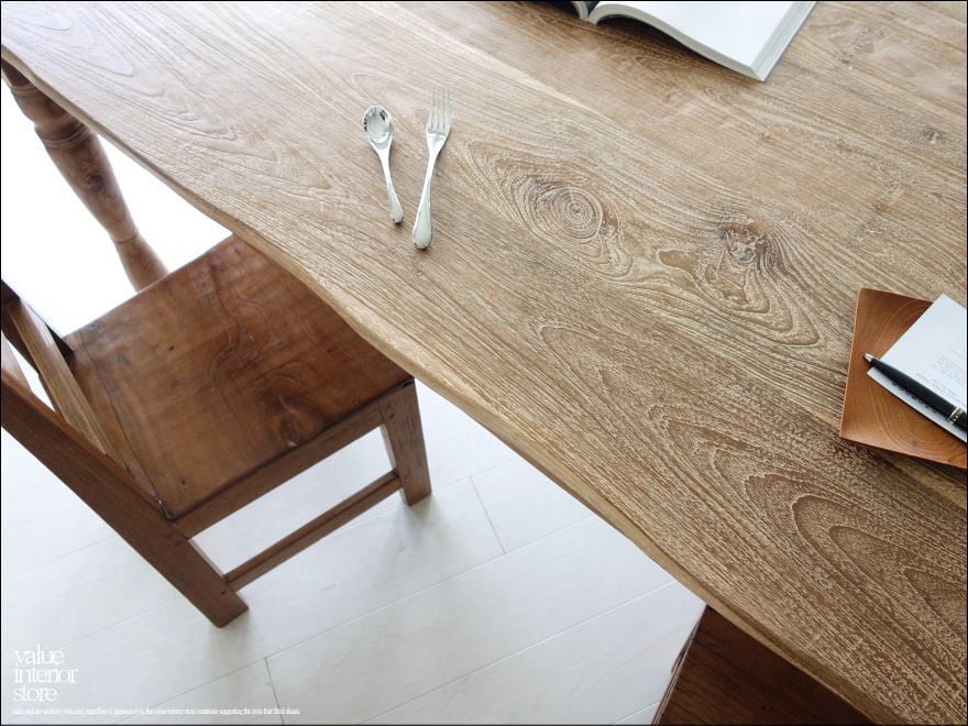 フシや凹凸などの変化に富んだ素材の味わい深さが感じられる、オールドチーク総無垢材のダイニングテーブル。天板を支えるフレーム部分にもしっかりと厚みがあり重厚感があります。