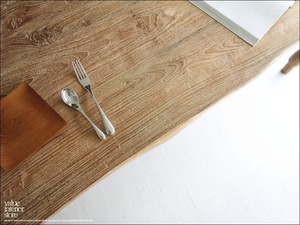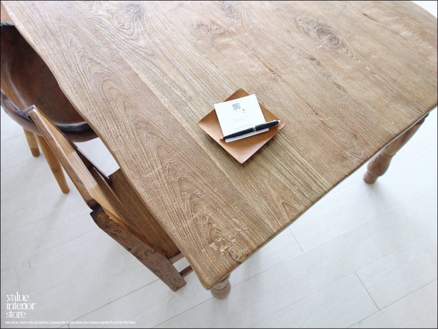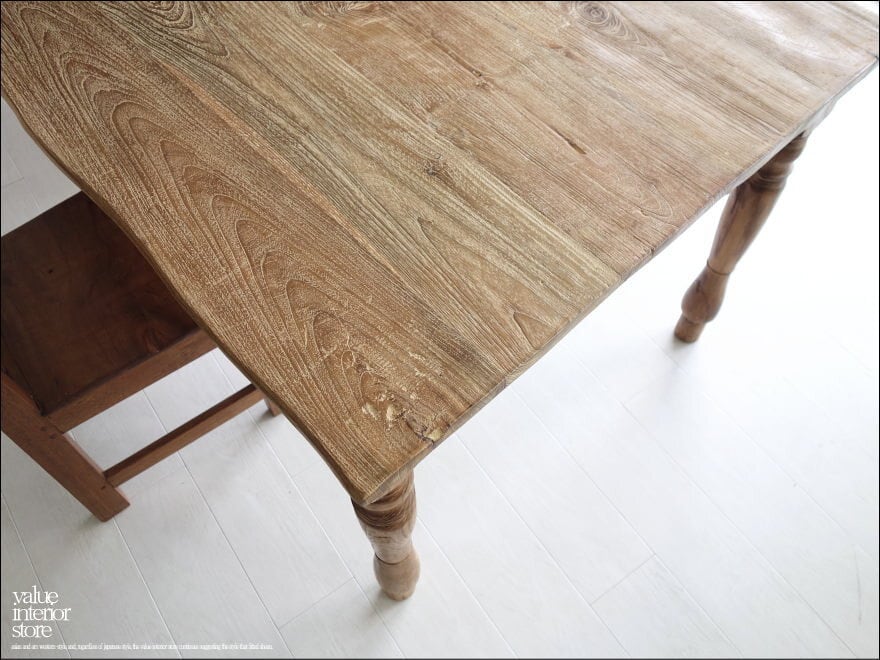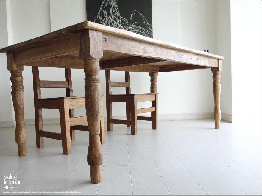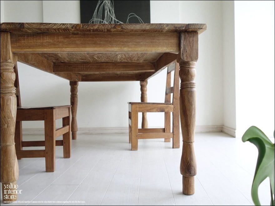 昔から使っていたような、古材家具ならではの落ち着いた大人の雰囲気に仕上がりました。チークの渋く硬い特徴を引き出す角型の天板を柔らかな丸脚が支えていて、そのバランスも上品です。シンプルなデザインで、チークの良さを存分に楽しんでいただける素敵ななダイニングテーブル。ショップやカフェのテーブルとしてもおすすめです。