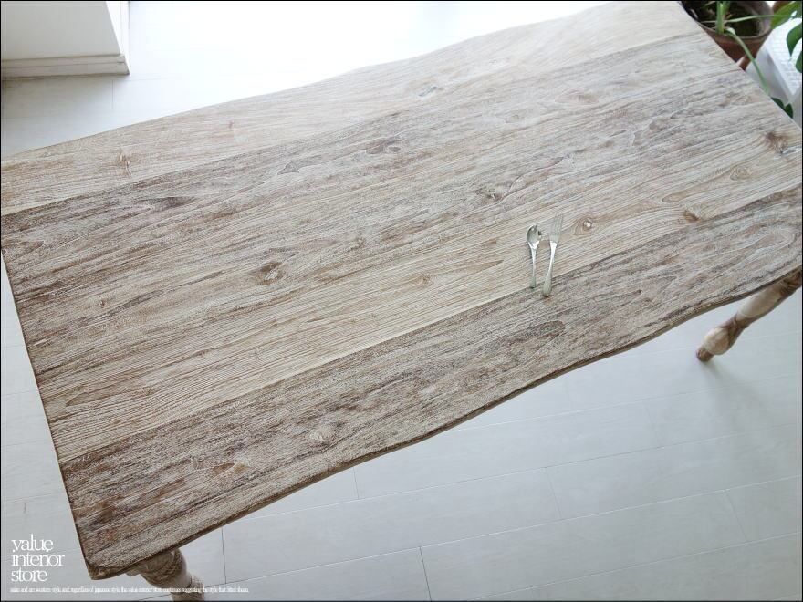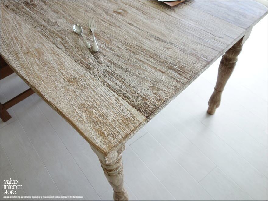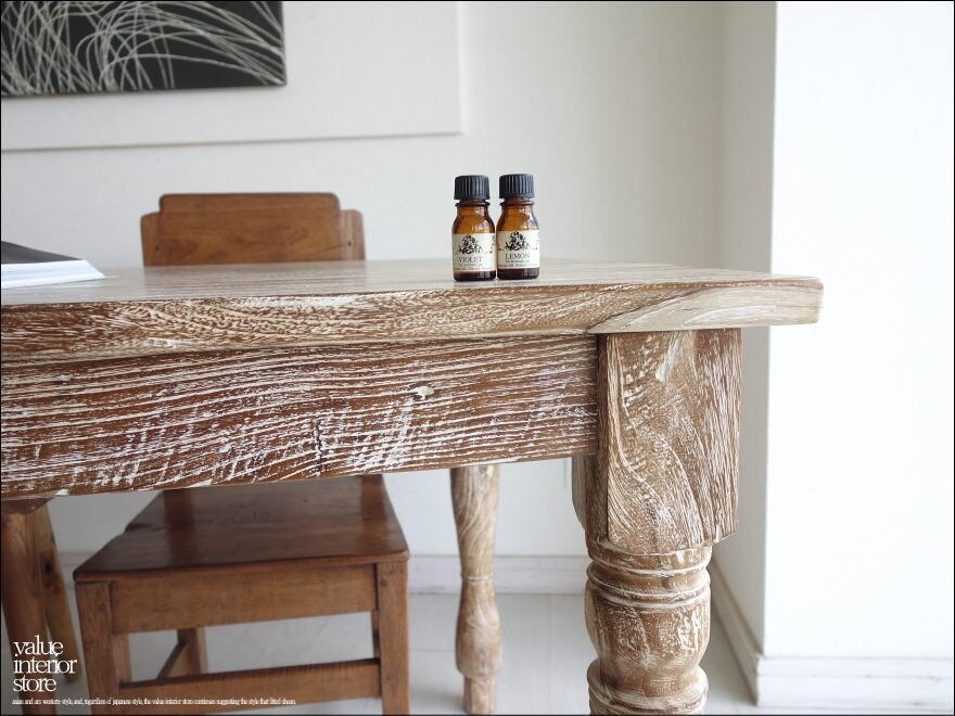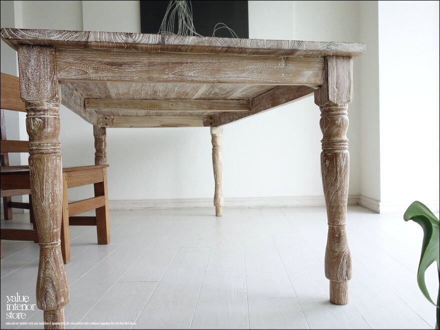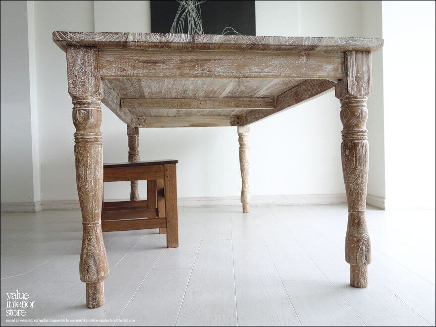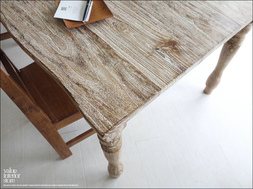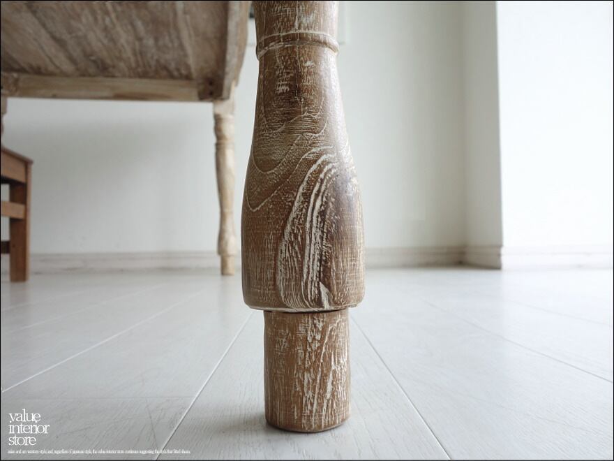 凹みに入った白色が昔から使っていたようなシャビーな質感を引き出していて、古材家具ならではの落ち着いた大人の雰囲気に仕上がりました。チークの渋く硬い特徴を引き出す角型の天板を、柔らかな丸脚が支えていてそのバランスも上品です。ショップやカフェのテーブルとしてもおすすめです。