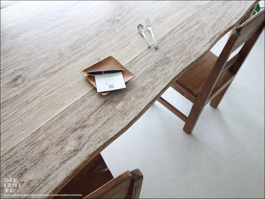 フシなどの変化に富んだ素材の味わい深さが感じられる、オールドチーク総無垢材のダイニングテーブル。天板を支えるフレーム部分にもしっかりと厚みがあり重厚感があります。