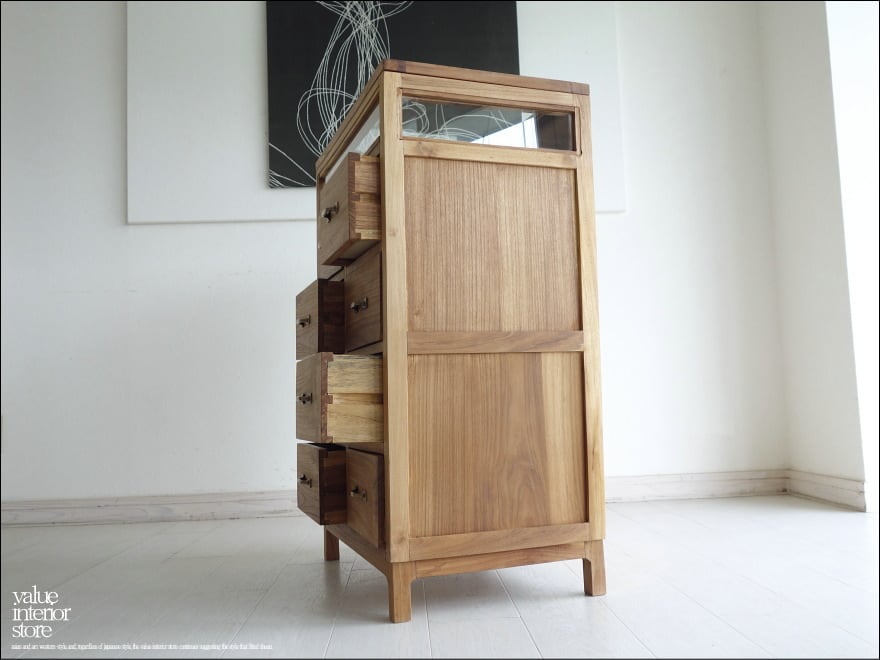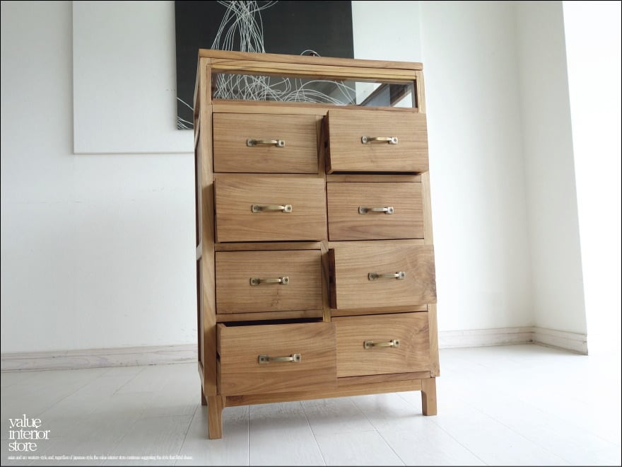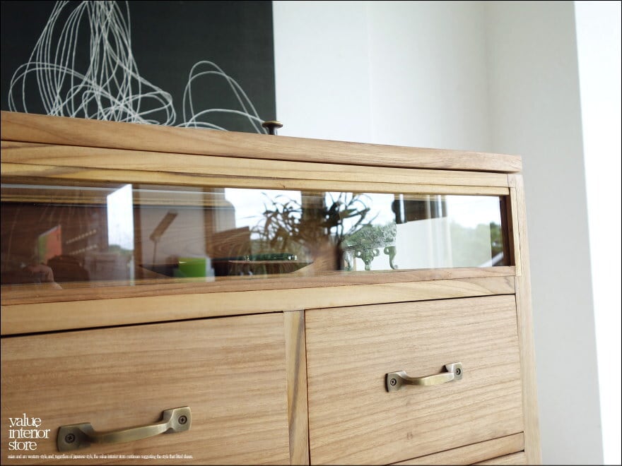 チーク無垢材 ショーケース付チェストN 整理タンス ナチュラル 箪笥 ガラスケース 収納 引出し八杯 真鍮金物 銘木家具 idachest