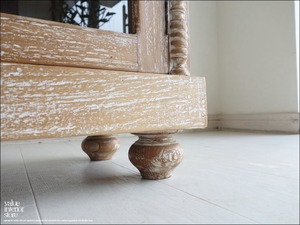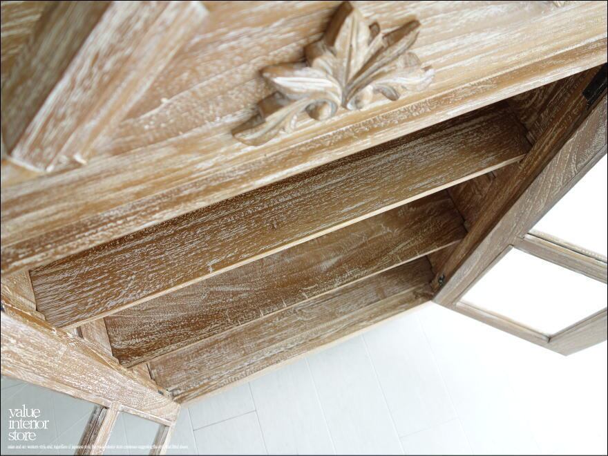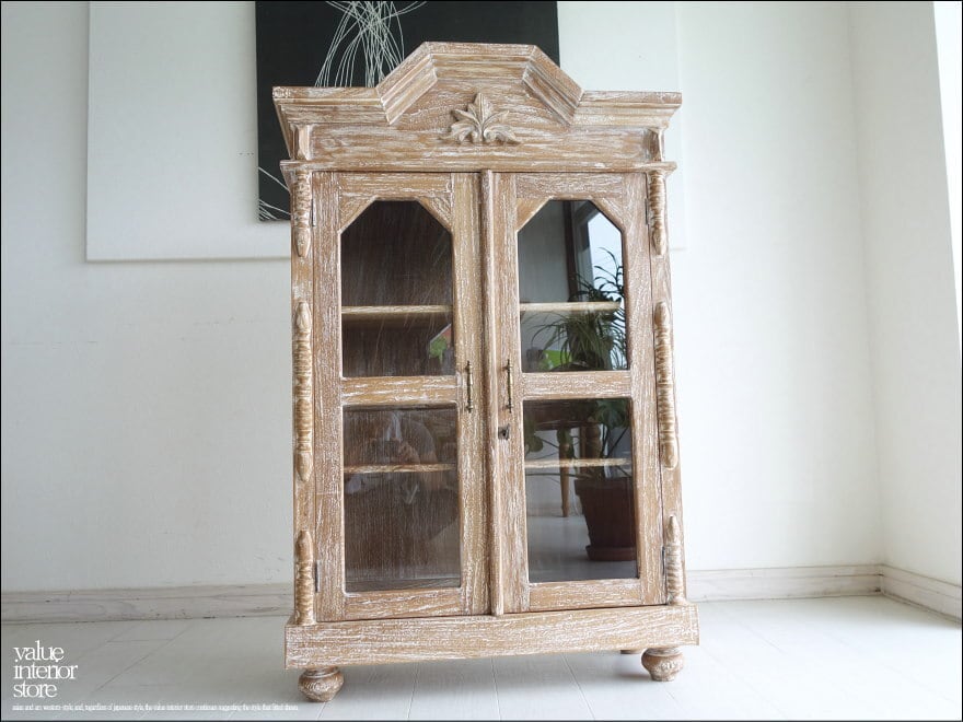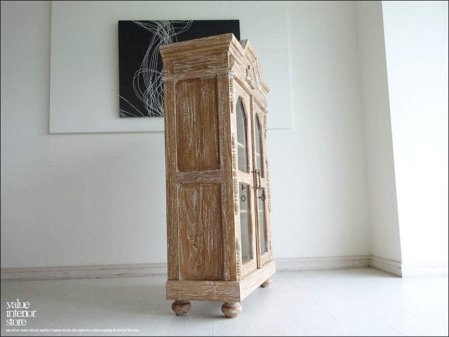 凹みなどに白色を薄くぼかして塗布してあるエイジング仕上げで、チークの持つ張りと硬く美しい木目の特徴が感じられます。ほどよい大きさでリビングの飾り棚として便利にお使いいただける鍵付きキャビネットです。上部の彫り物が、この家具のシンボルマークとなっていて印象的です。クリアガラスで中身が見えるのでディスプレイするような感覚で中に入れるものにもこだわりたくなります。