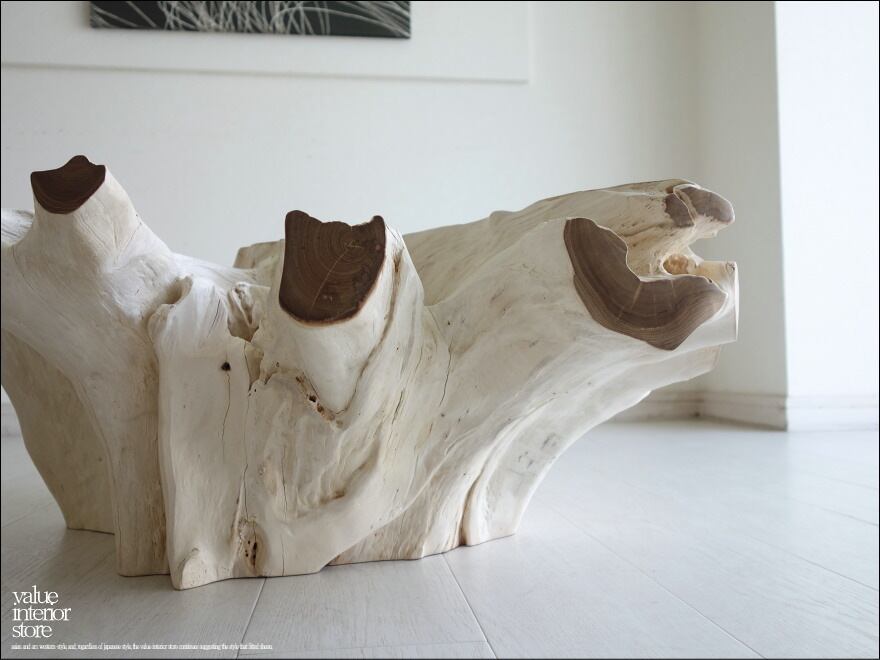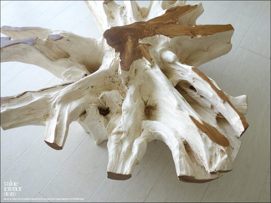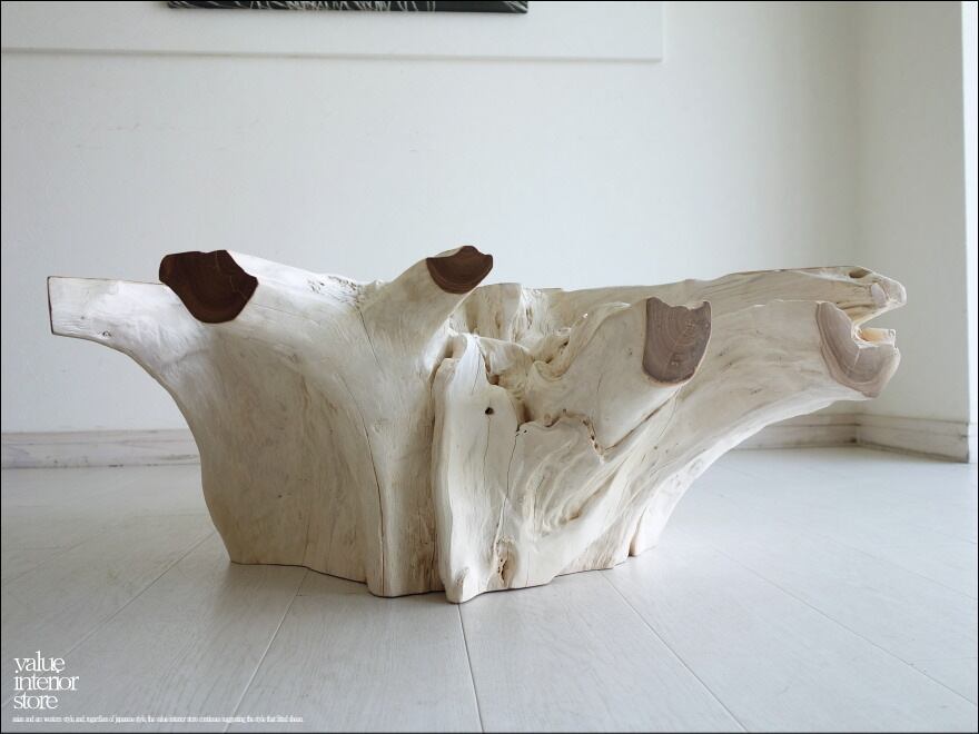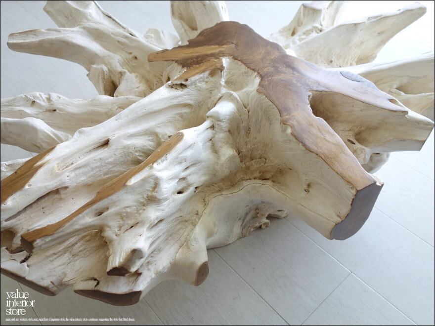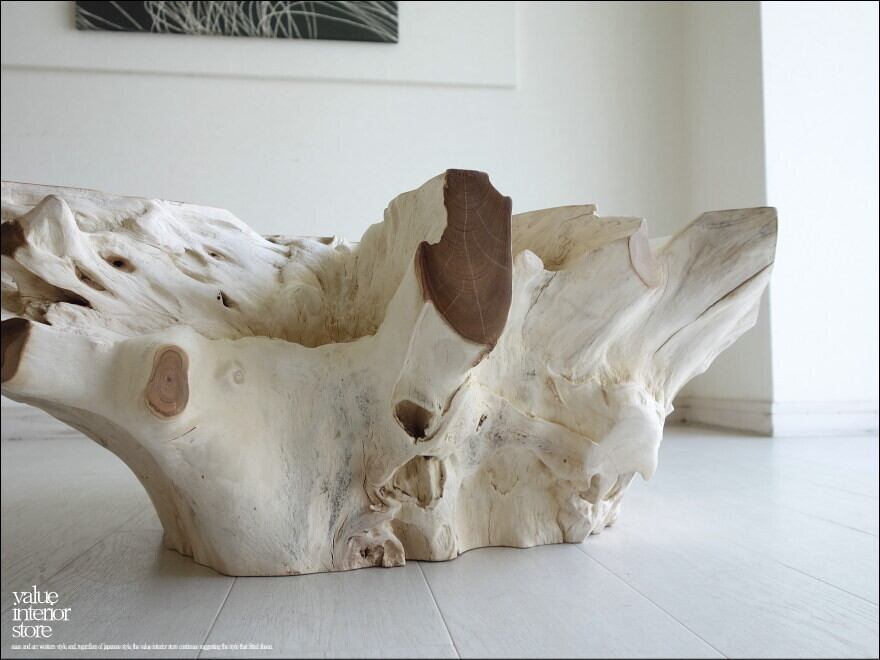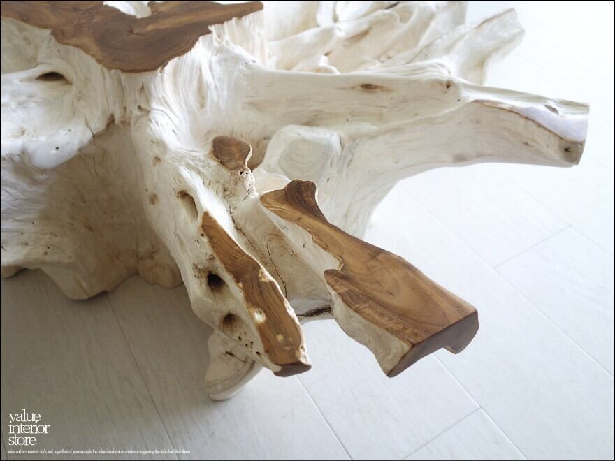 チークの根本をテーブルに使った何ともプリミティブなガラステーブル。