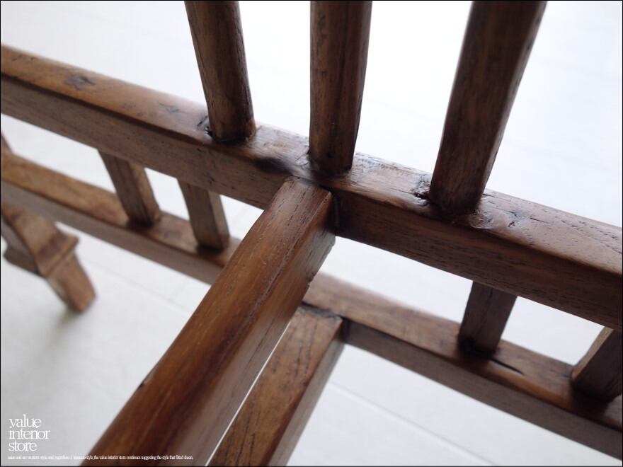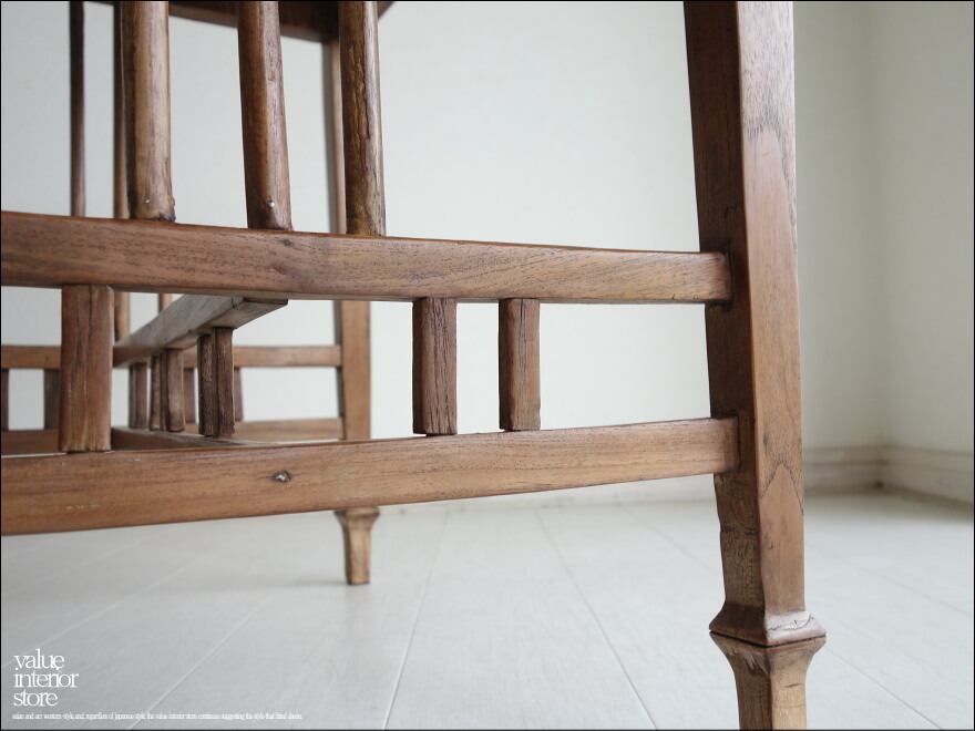 一度主要フレームを分解後、組み立て直し、表面を研磨してシェラックで仕上げていますので、やや光沢のある仕上がりです。本来の質感を損なわず、新しいものとして生まれ変わっています。スローダウンした雰囲気はそのままに、これからも永くお使いいただけます。西洋、アジアン、和風モダン、北欧など幅広いテイストのインテリアと相性良くコーディネートできますのでお気に入りスペースでお使いください。