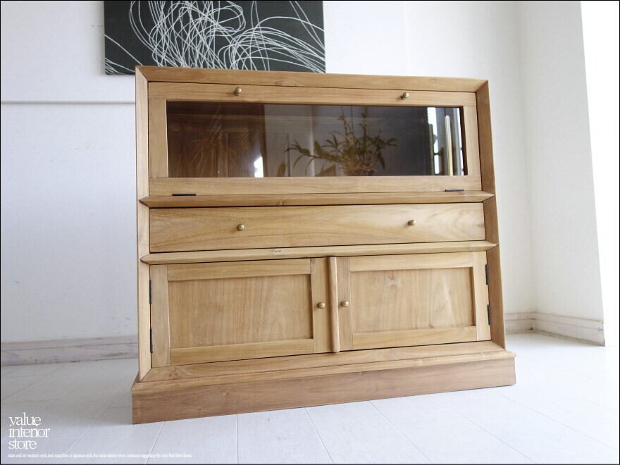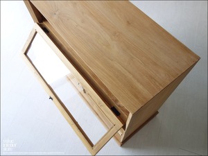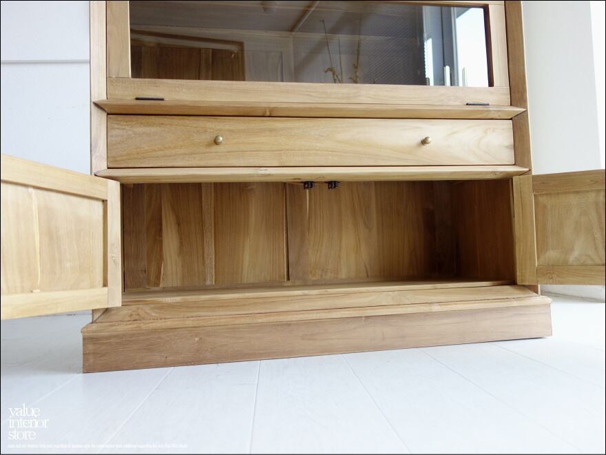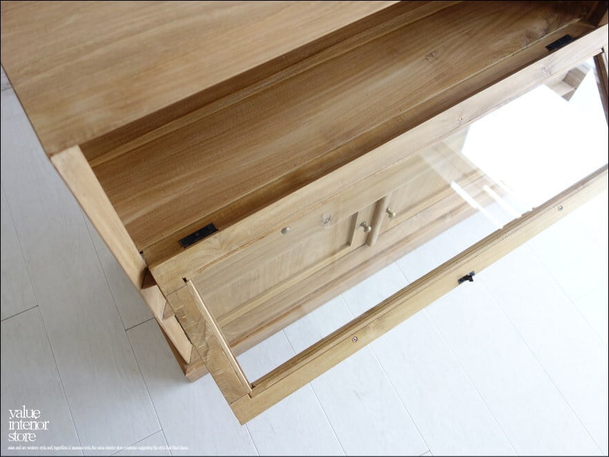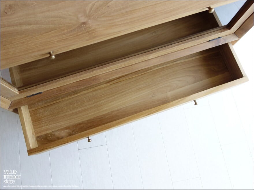 一番上のガラス扉は手前に引いて開きます。中断には引出し、下は観音扉のキャビネットとそれぞれ異なった用途にお使いいただけますので、リビングやキッチンでは保管庫などとしても収納力を発揮します。