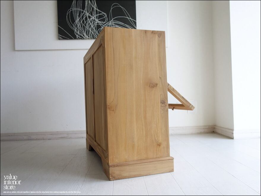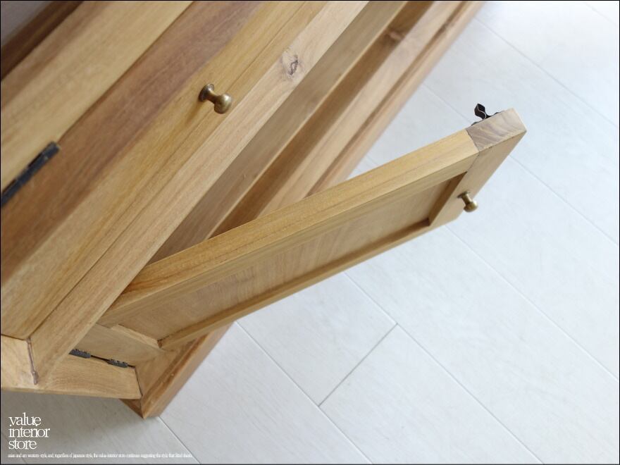 ツマミや扉の丁番、また丁番を留める木ネジも全てに真鍮製のものを使用しました。表面はアンフィニッシングですので、変わり行く色の変化(いわゆるチークカラーへの変化)をお楽しみいただけます。1点1点手作りで、無垢材の質の良さを十分に感じさせてくれます。お気に入りスペースでお使い下さい。