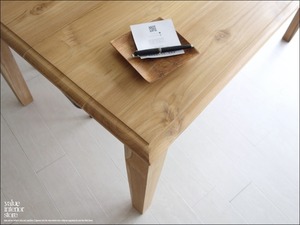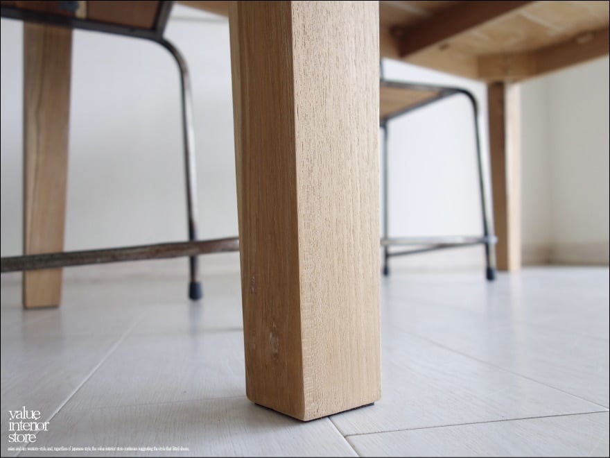 天板を支える脚は太さがあり、どっしりとしていて力強いです。チークの特徴のある木目やフシなどの個性的なキャラクターが素敵で、また、手作りでしか出せない素朴な質感が何とも言えません。良質な油分を豊富に含むチーク材ですので、徐々にチーク色に変化していくところも楽しんでいただけるダイニングテーブル。こんなテーブルで毎日食事ができたらステキでしょうね。ショップやカフェのテーブルとしてもおすすめです。