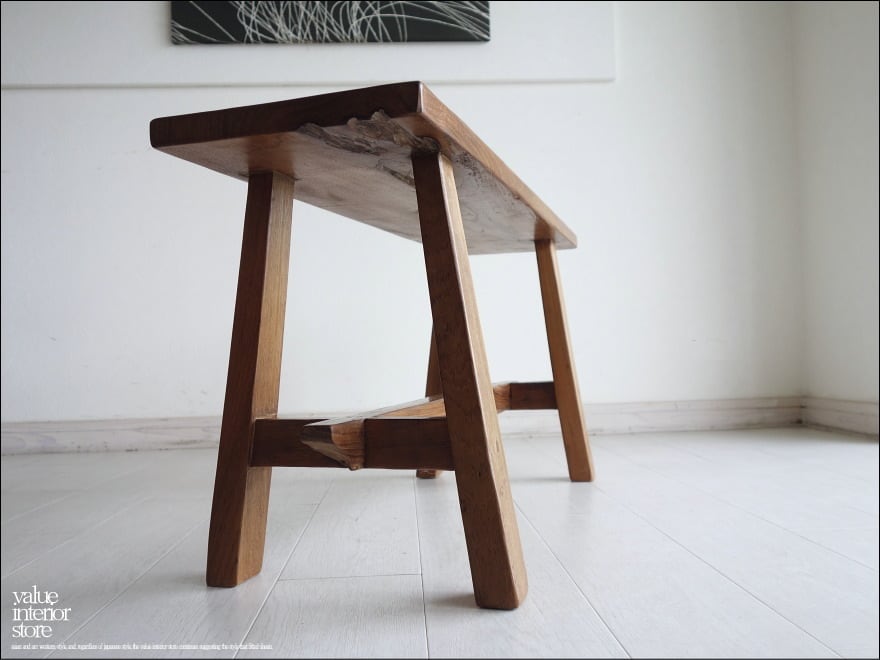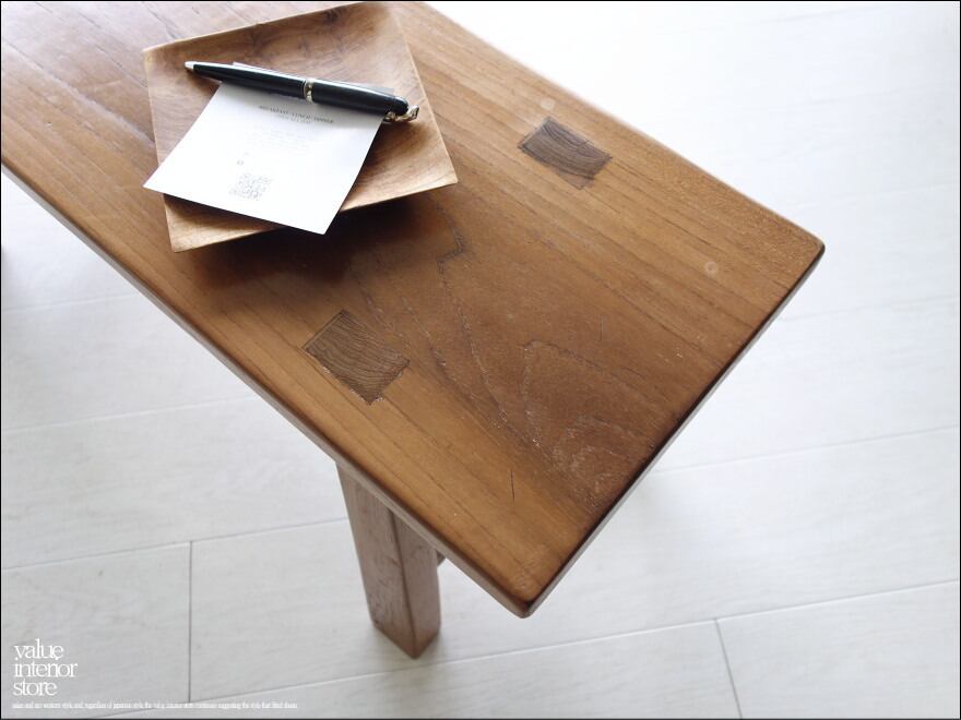 一枚板の座面は厚みもあり長くお使いいただけるしっかりした作りです。チークならではの美しい木目が全体的に見られ味わい深いお品。職人さんが丹精こめて作った印象に溢れていて、きっとお部屋をスローダウンした素敵な雰囲気に包んでくれます。ベンチだけでなくインテリアのディスプレイ台としてもステキです。この機会にぜひどうぞ。