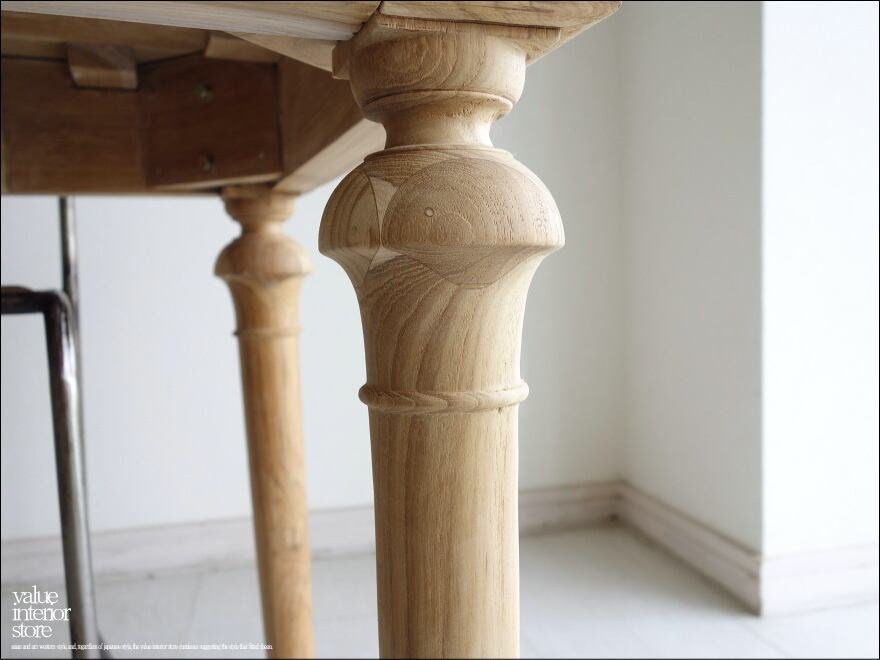 天板を支える脚、また、幕板もこだわったデザインで落ち着いた大人の雰囲気があります。チークの渋く硬い特徴やフシなどの木が本来持つ個性的なキャラクターが面白く、また、手作りでしか出せない素朴な質感とのバランスもとても良いです。良質な油分を豊富に含むチーク材ですので、徐々にチーク色に変化していくところも楽しんでいただけるテーブルです。カフェのテーブルとしてもおすすめです。