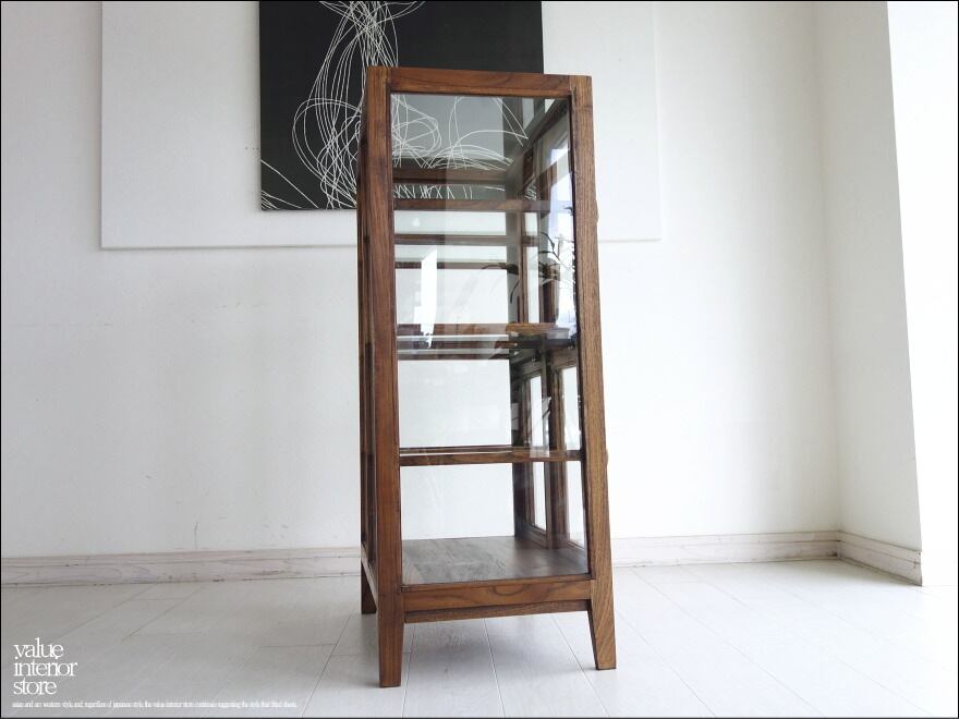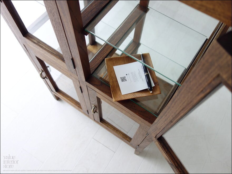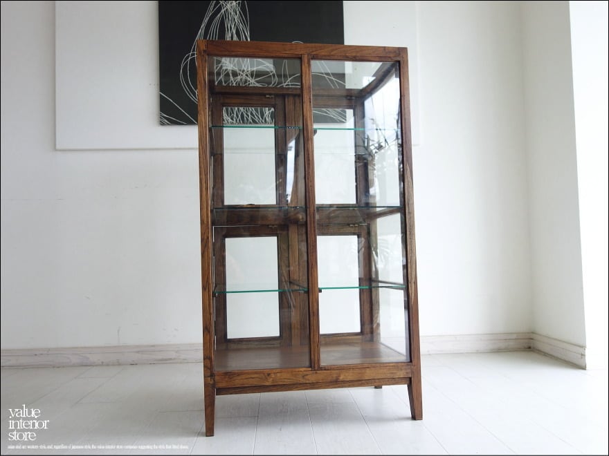 フレームは贅沢にチーク総無垢で、金具は真鍮製を使用いたしました。4面ガラスでどの角度からも中がキレイに見えますので、お店のショーケースとしてもお使いいただけます。また扉は上下2つに分かれていて上の扉には真鍮のロックも付いています。アンティークではありませんが古くからそこにあったような温か味のある仕上がりになっています。カフェなどのパン用ショーケース、食器棚、小物のディスプレイなど幅広くお使いください。