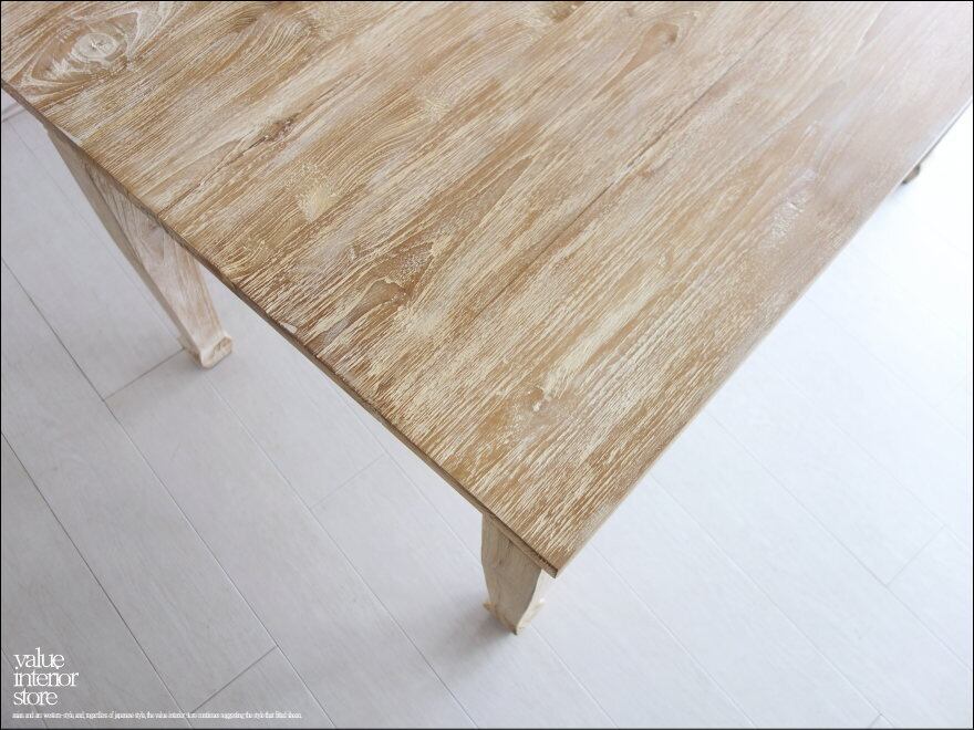チーク材の木目を起こし、白色を塗布してからペーパーで表面を仕上げるホワイトウォッシュ仕上げ。
