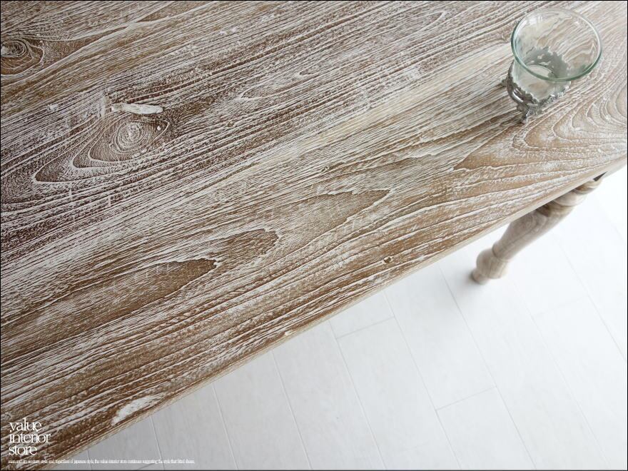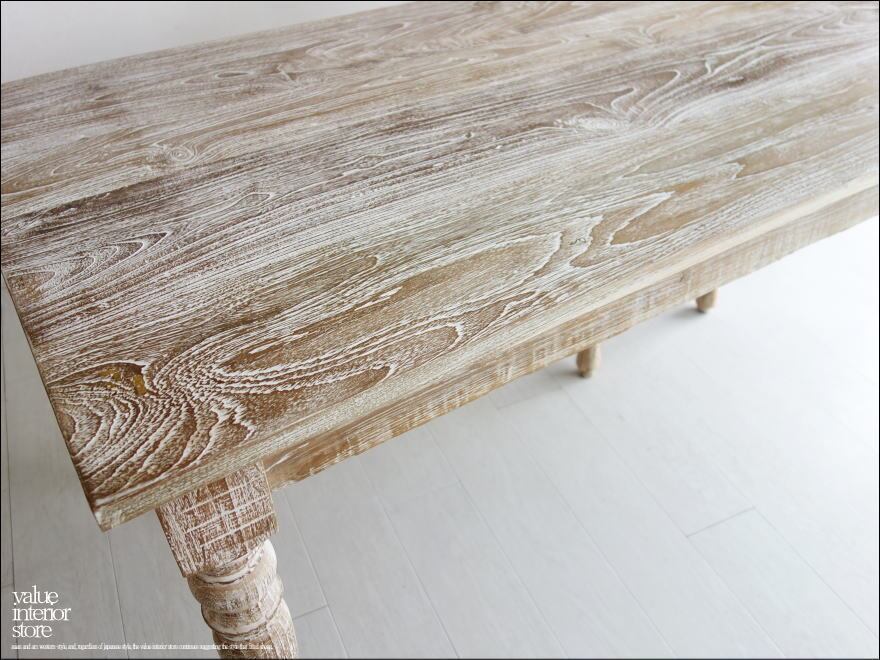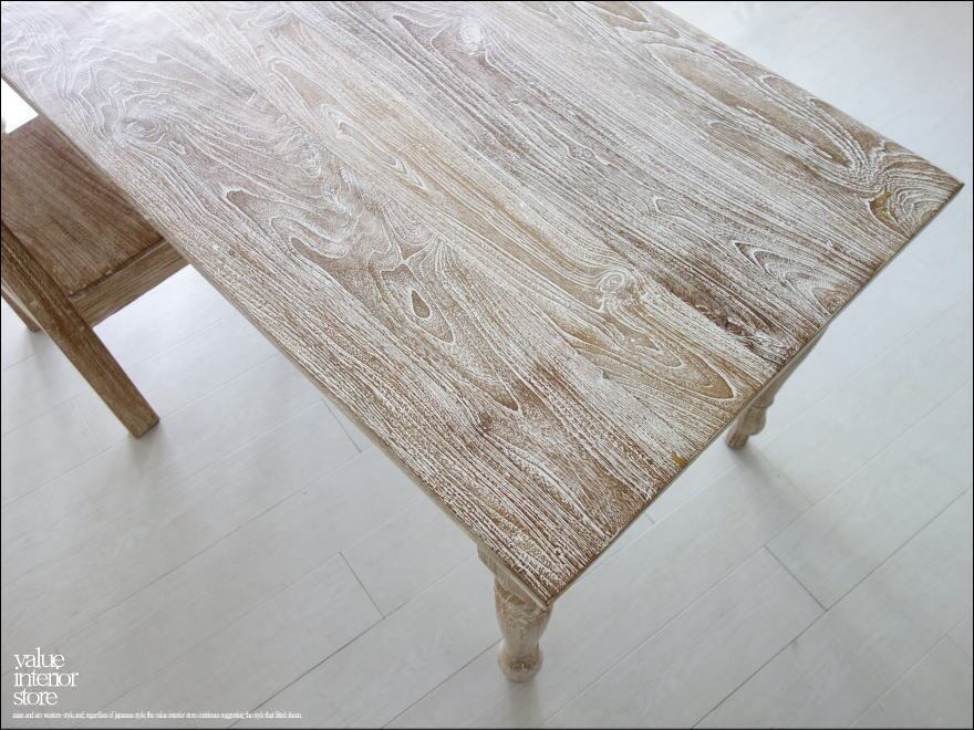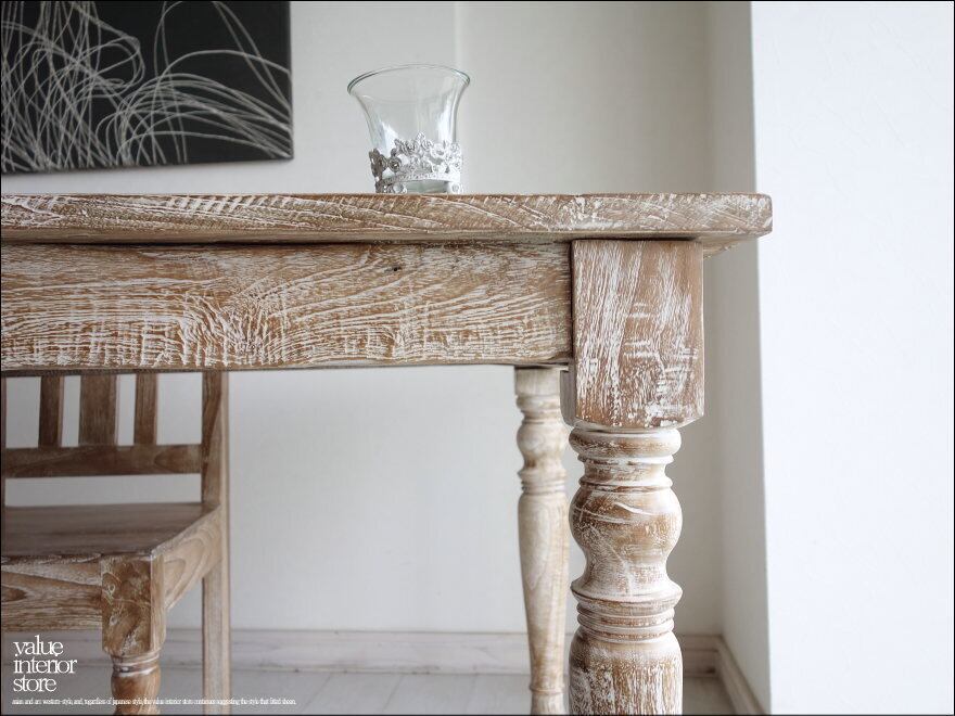 天板を支えるフレーム部分にもしっかりと厚みがあり重厚感があります。凹みに入った白色が昔から使っていたようなシャビーな質感を引き出していて、古材家具ならではの落ち着いた大人の雰囲気に仕上がりました。チークの渋く硬い特徴を引き出す角型の天板を、柔らかな丸脚が支えていてそのバランスも上品です。ショップやカフェのテーブルとしてもおすすめです。