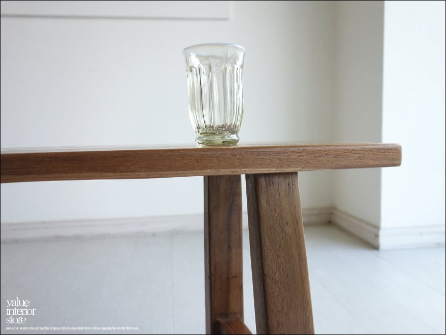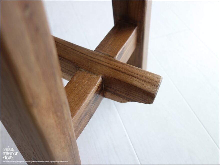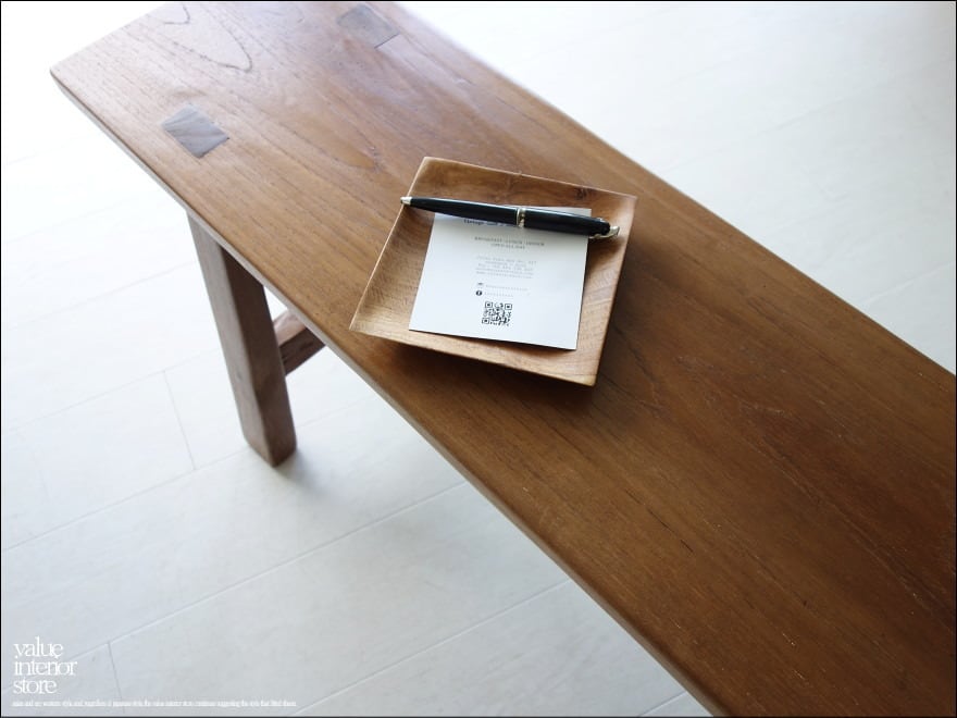 一枚板の座面は厚みもあり長くお使いいただけるしっかりした作りです。チークならではの木目と古材ならではの木肌が全体的に見られ味わい深く仕上がっています。職人さんが丹精こめて作った印象に溢れていて、きっとお部屋をスローダウンした素敵な雰囲気に包んでくれます。ベンチだけでなくインテリアのディスプレイ台としてもステキです。